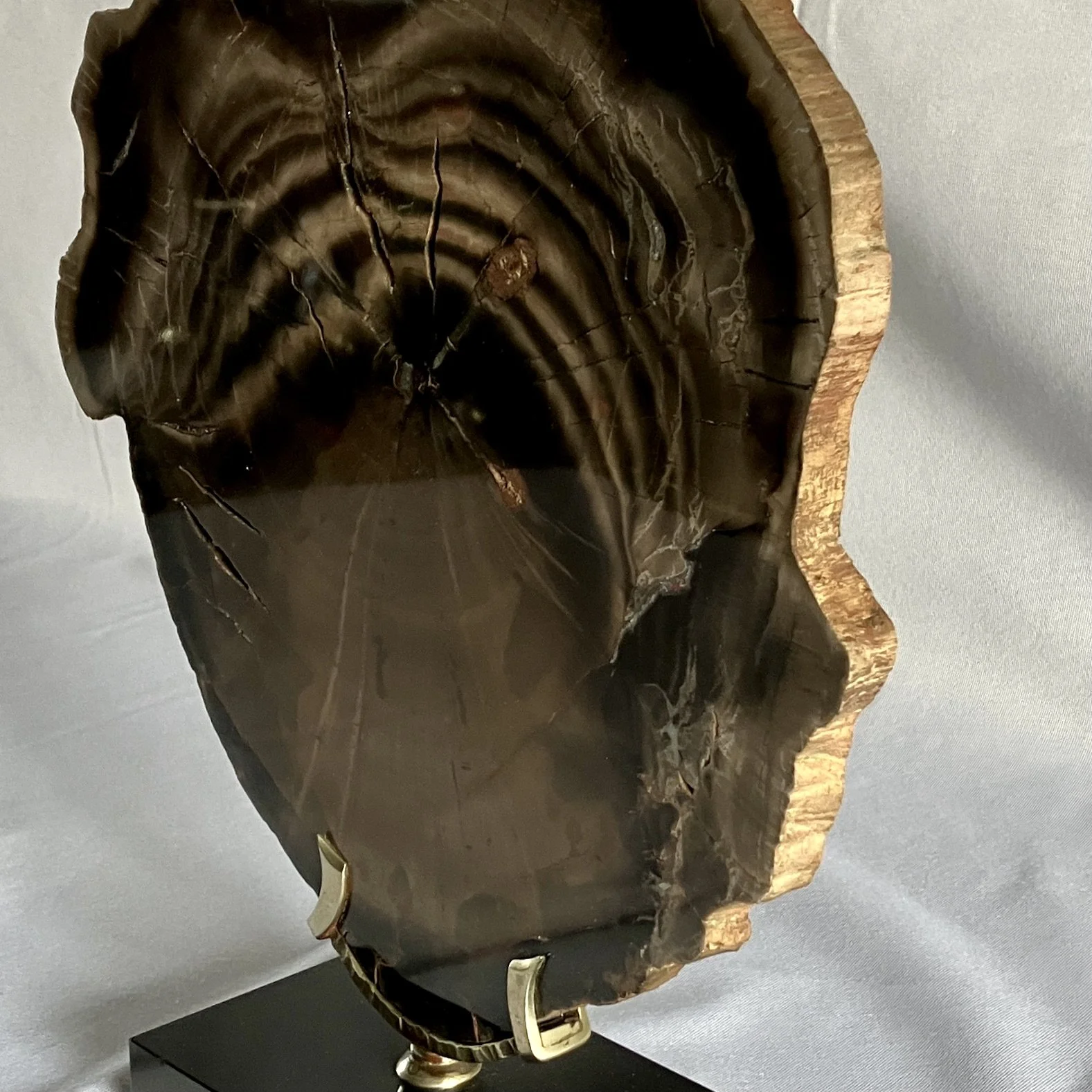 This is a large petrified wood specimen, a stunning relic of the distant past, polished to perfection and mounted on a bespoke stand. Its age is estimated to be between 120 - 240 million years old, hailing from the Triassic period.