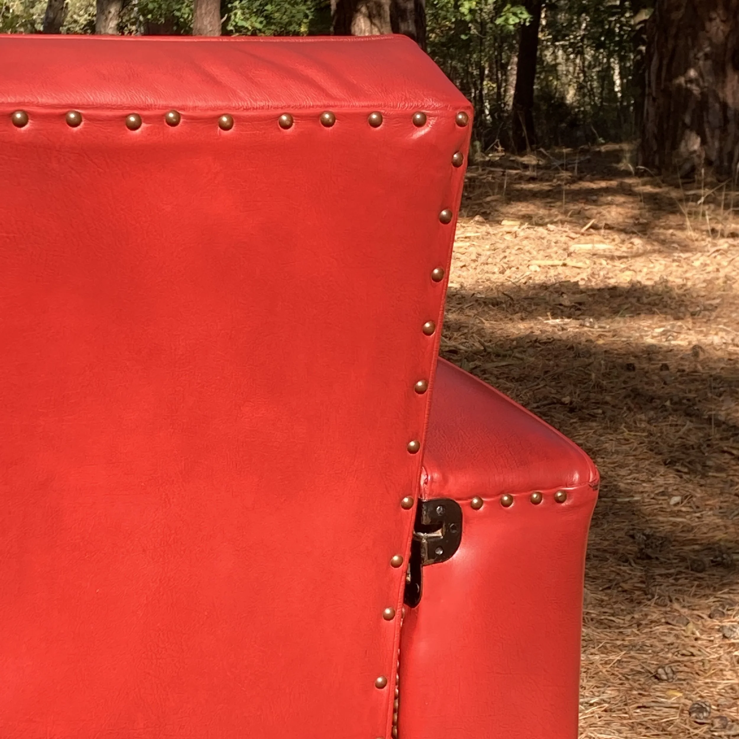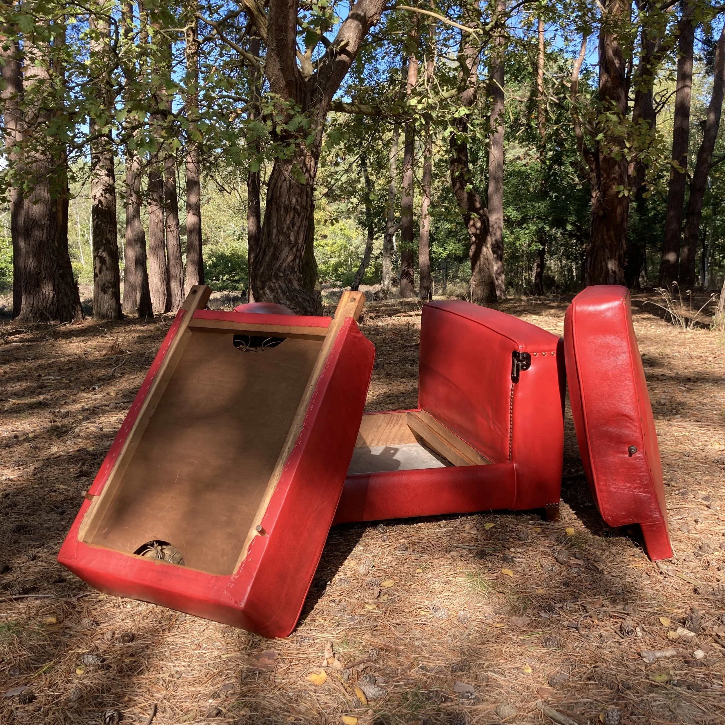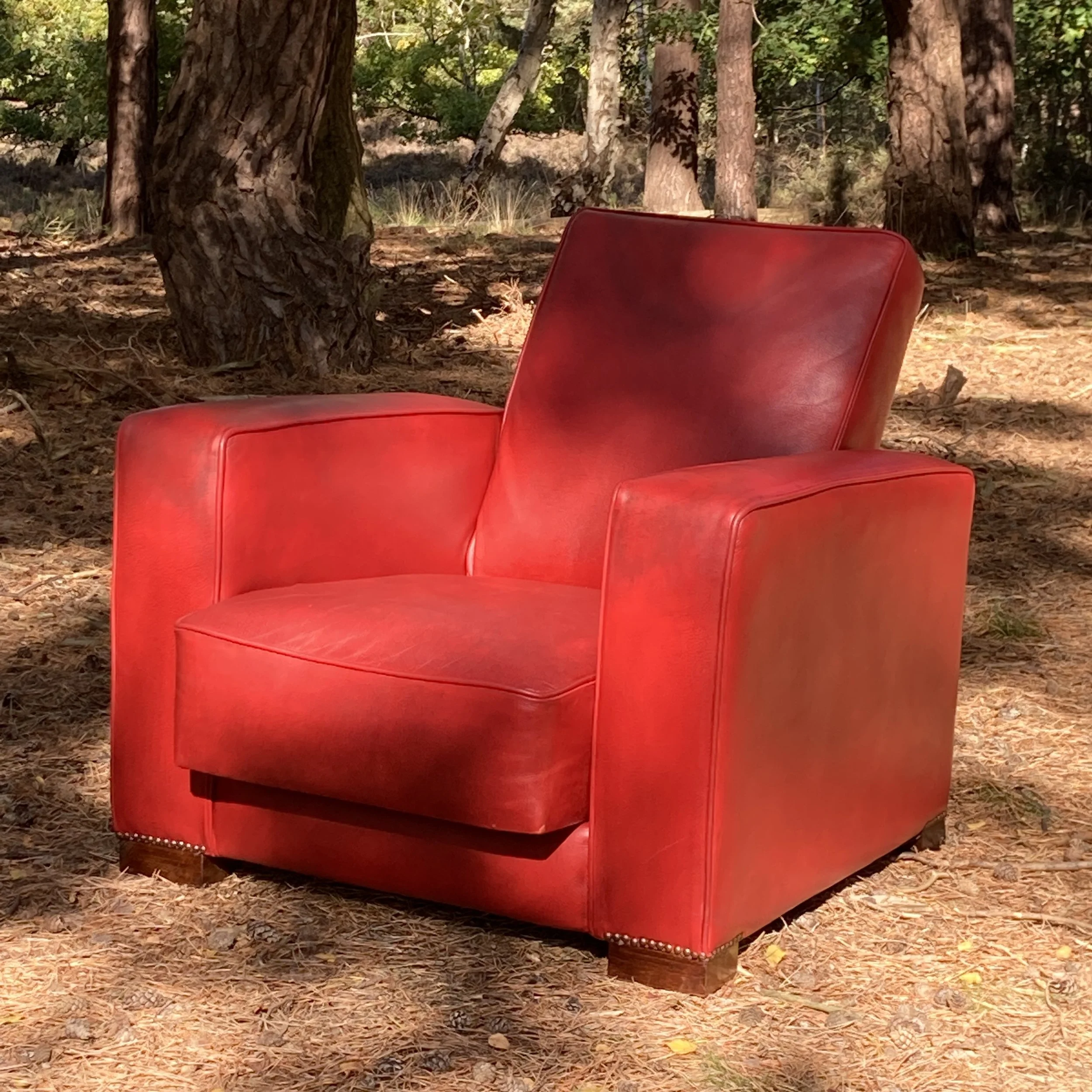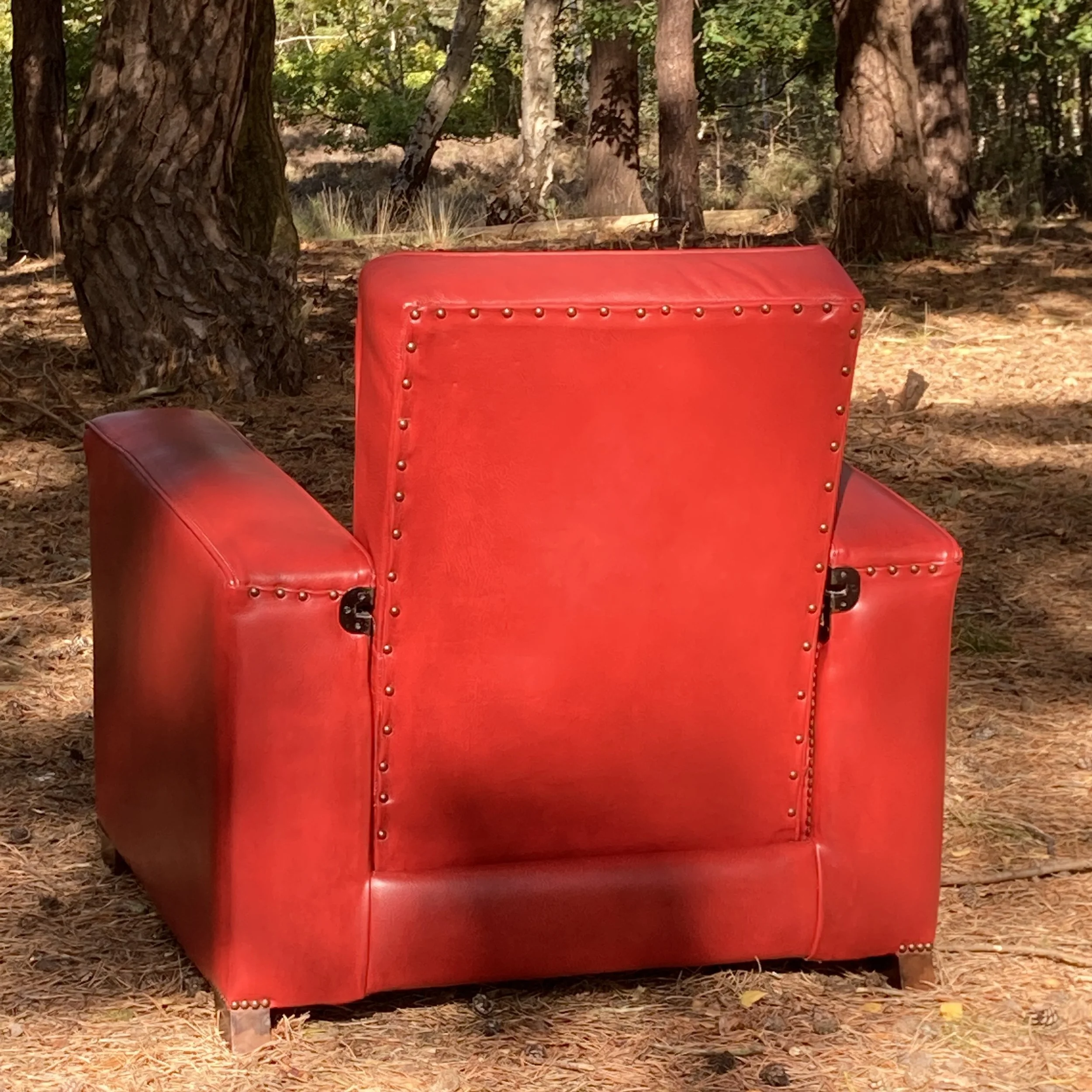 Stylish art deco club armchair upholstered in a vibrant red hide with no rips nor repairs. This chair has the very unusual feature of a reclining back and integral retracting drinks table. A highly unusual and rare chair.