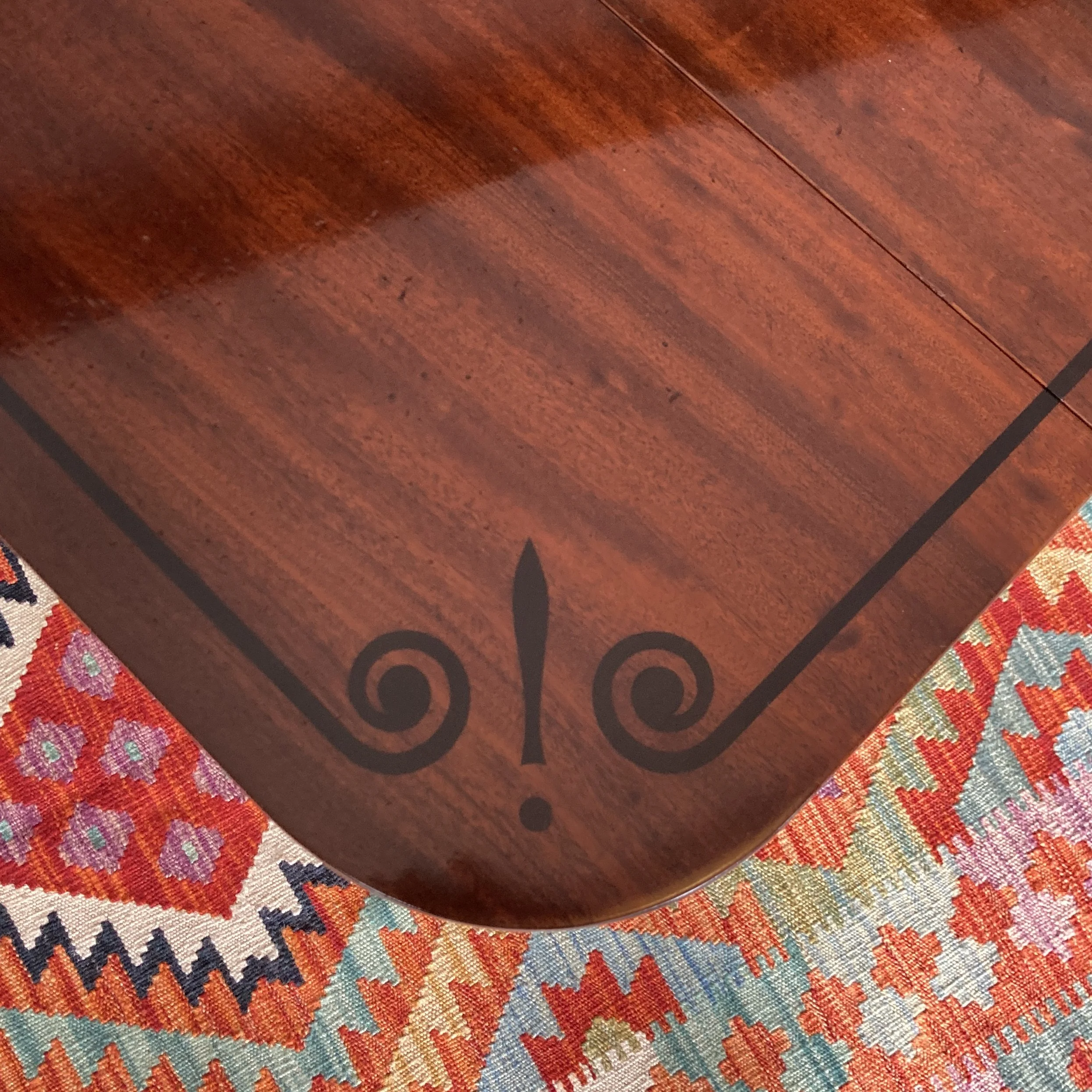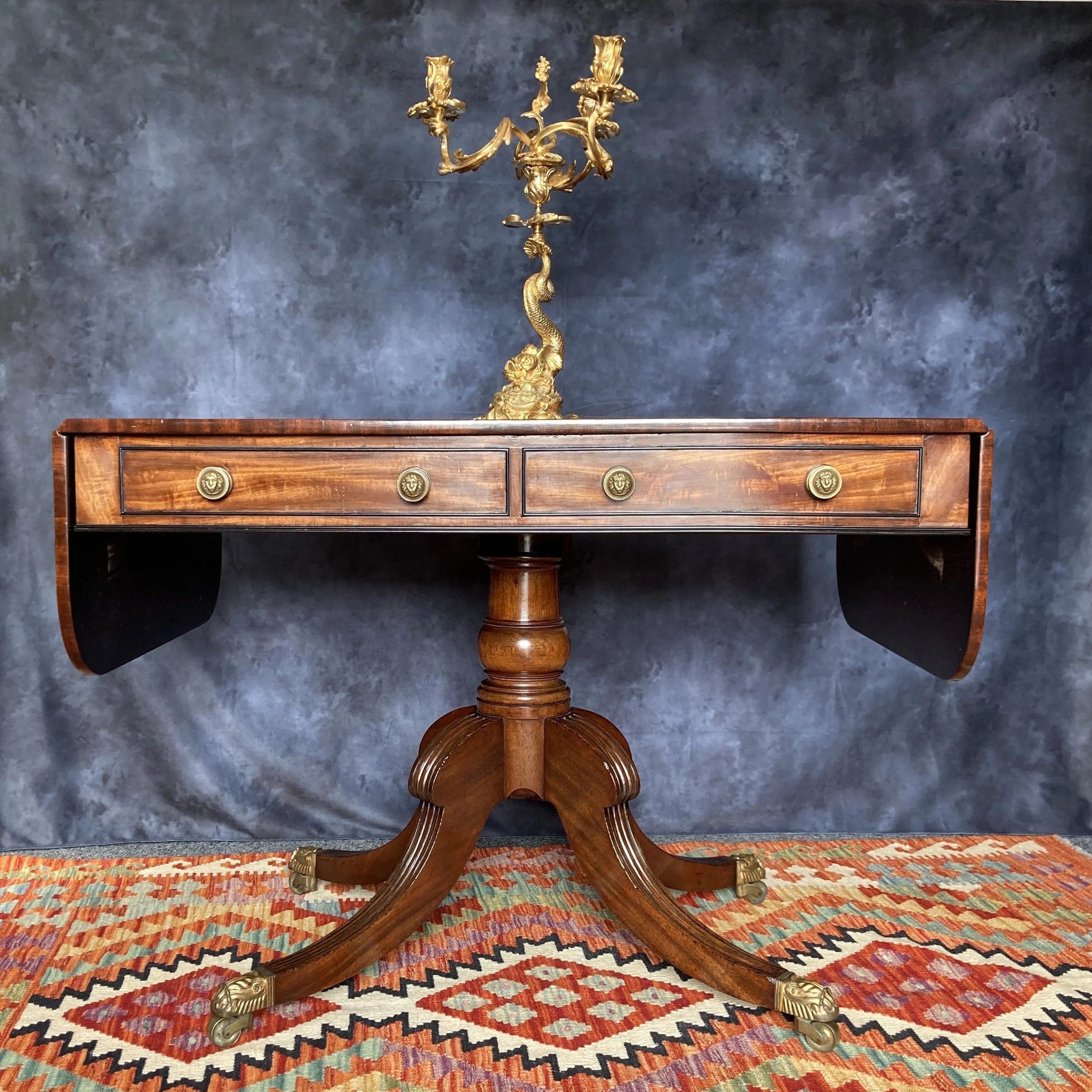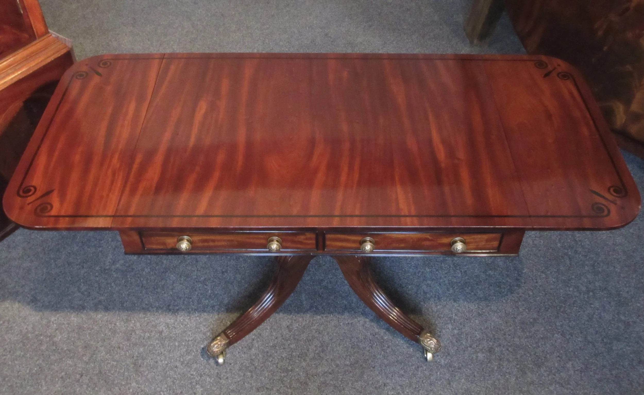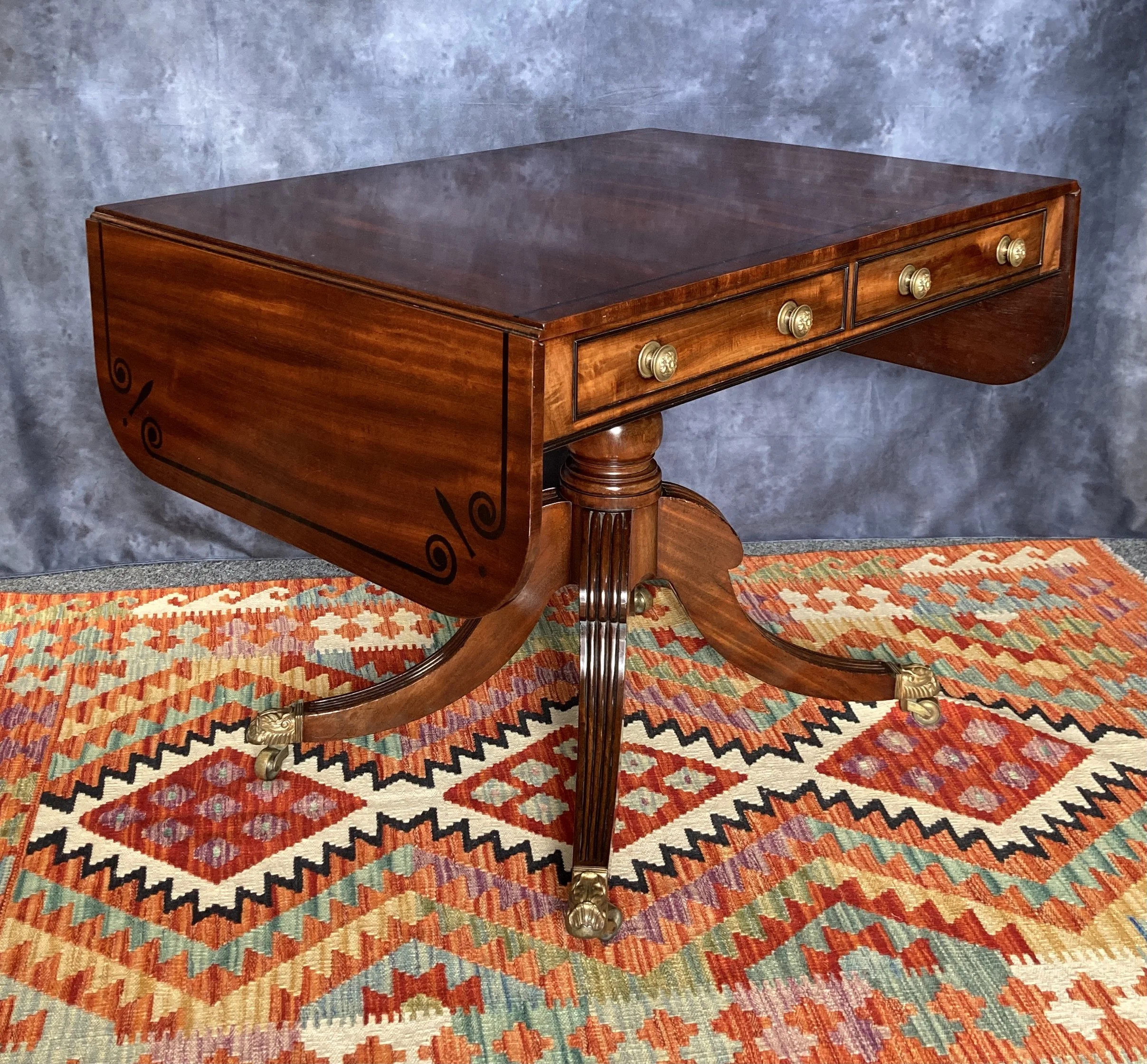 A fantastic Regency mahogany and ebony inlaid sofa table. A testament to the grandeur of its time, the table boasts a polished top, adorned with two functional frieze drawers, perfect for stowing away your cherished items. The artistry continues with two matching dummy drawers at the rear, a clever design that maintains the table’s symmetrical allure.