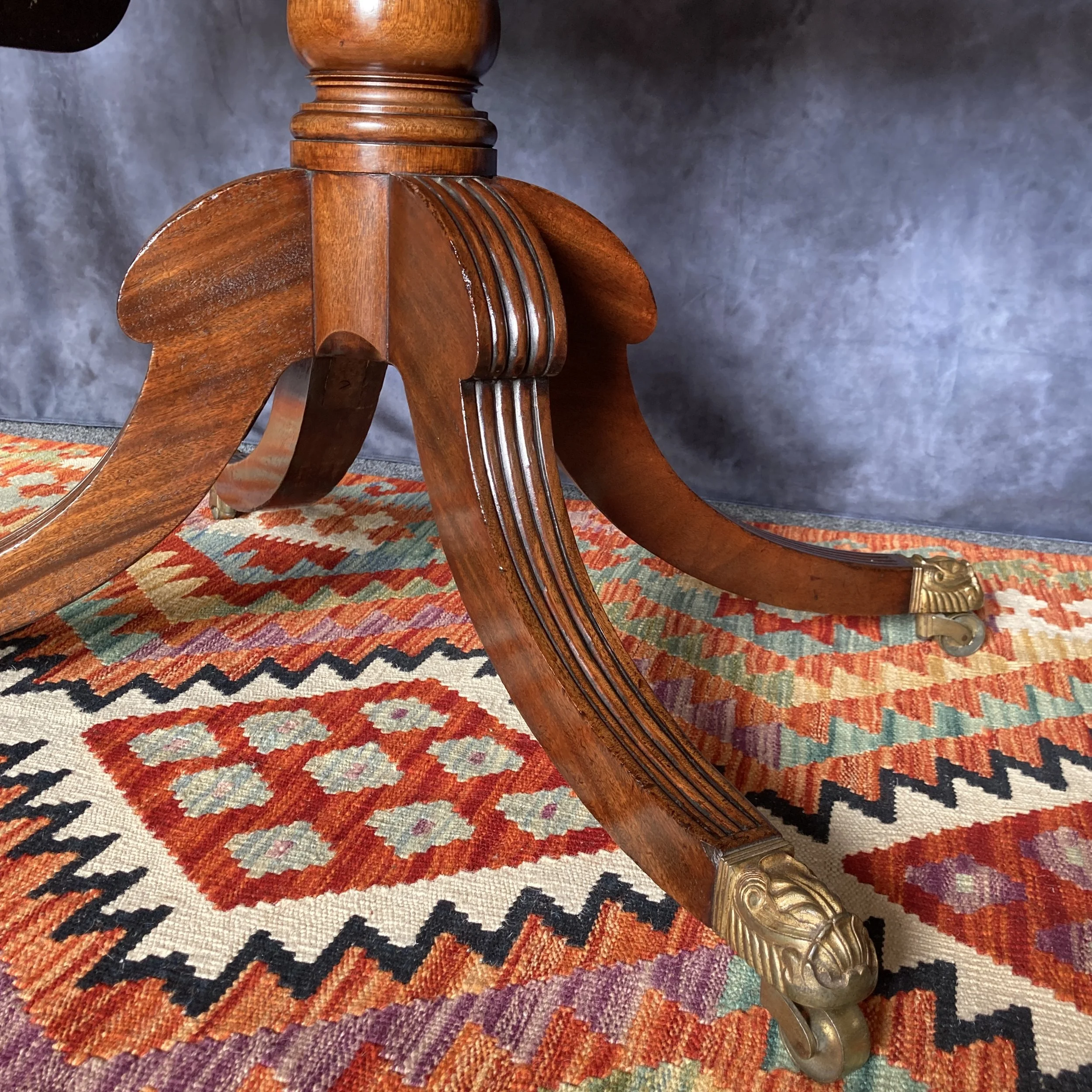 The table stands proudly on a central column, its curves turned with precision, evoking the refined taste of the Regency period. This column gives rise to boldly reeded sabre legs, a daring design choice that exudes confidence and stability. Each leg culminates in original gilt brass castors, their intricate details shimmering with a golden glow, adding both mobility and a touch of opulence.