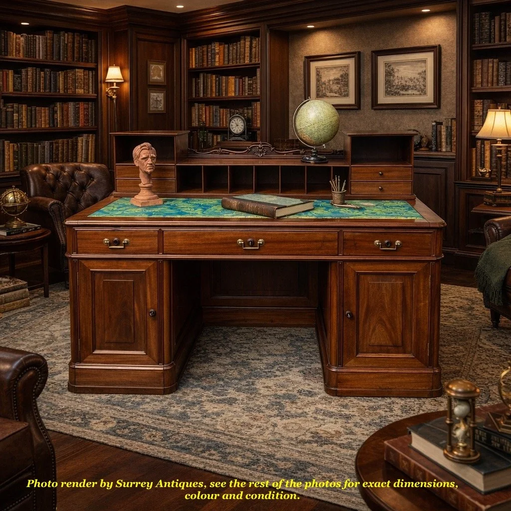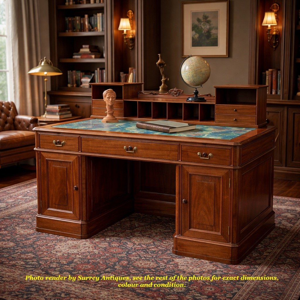 Attention to detail is evident in the panelled sides and back of the desk, allowing it to be freestanding and displayed prominently in any room, from all angles. The desk’s rich mahogany finish radiates warmth and sophistication, making it a focal point of any office or study.