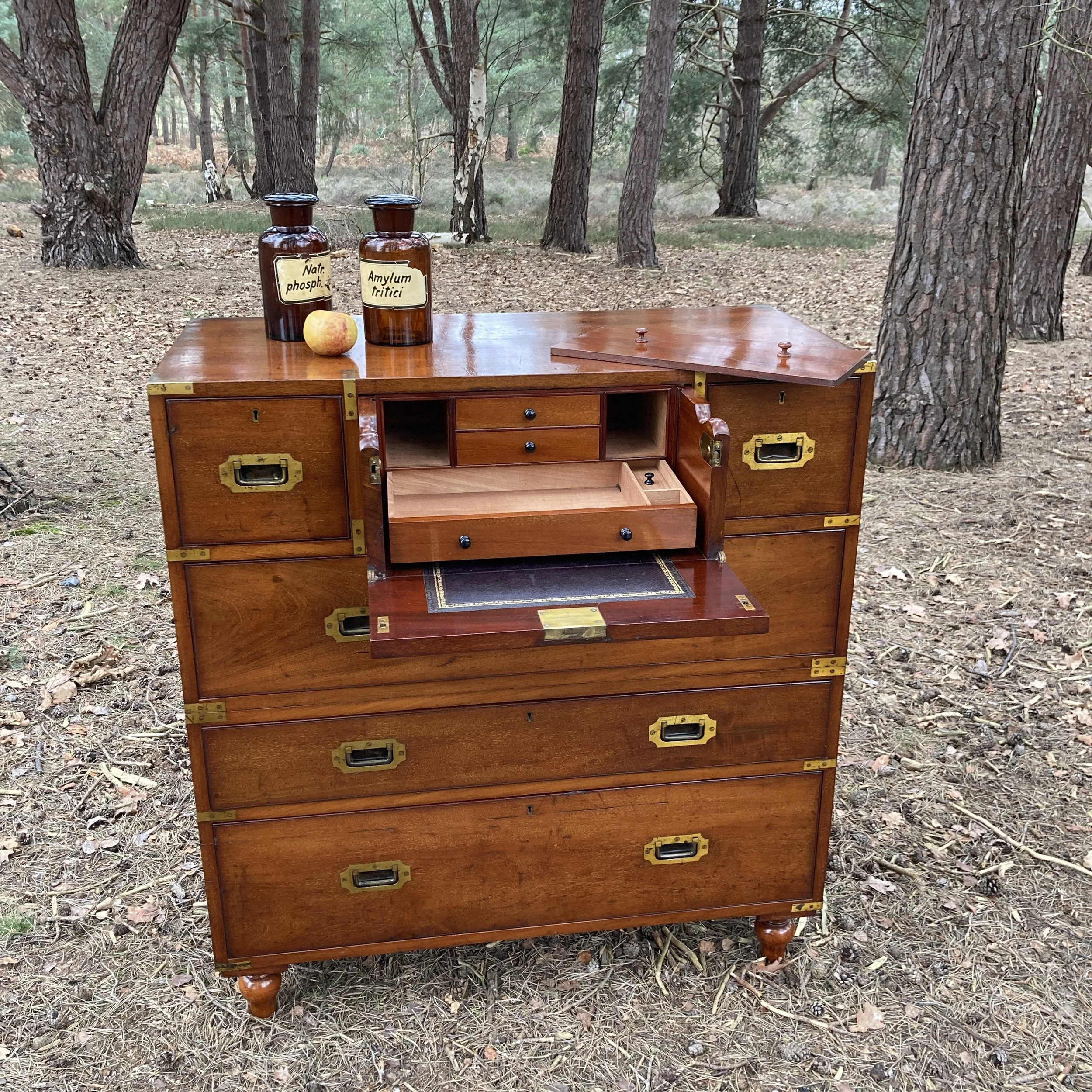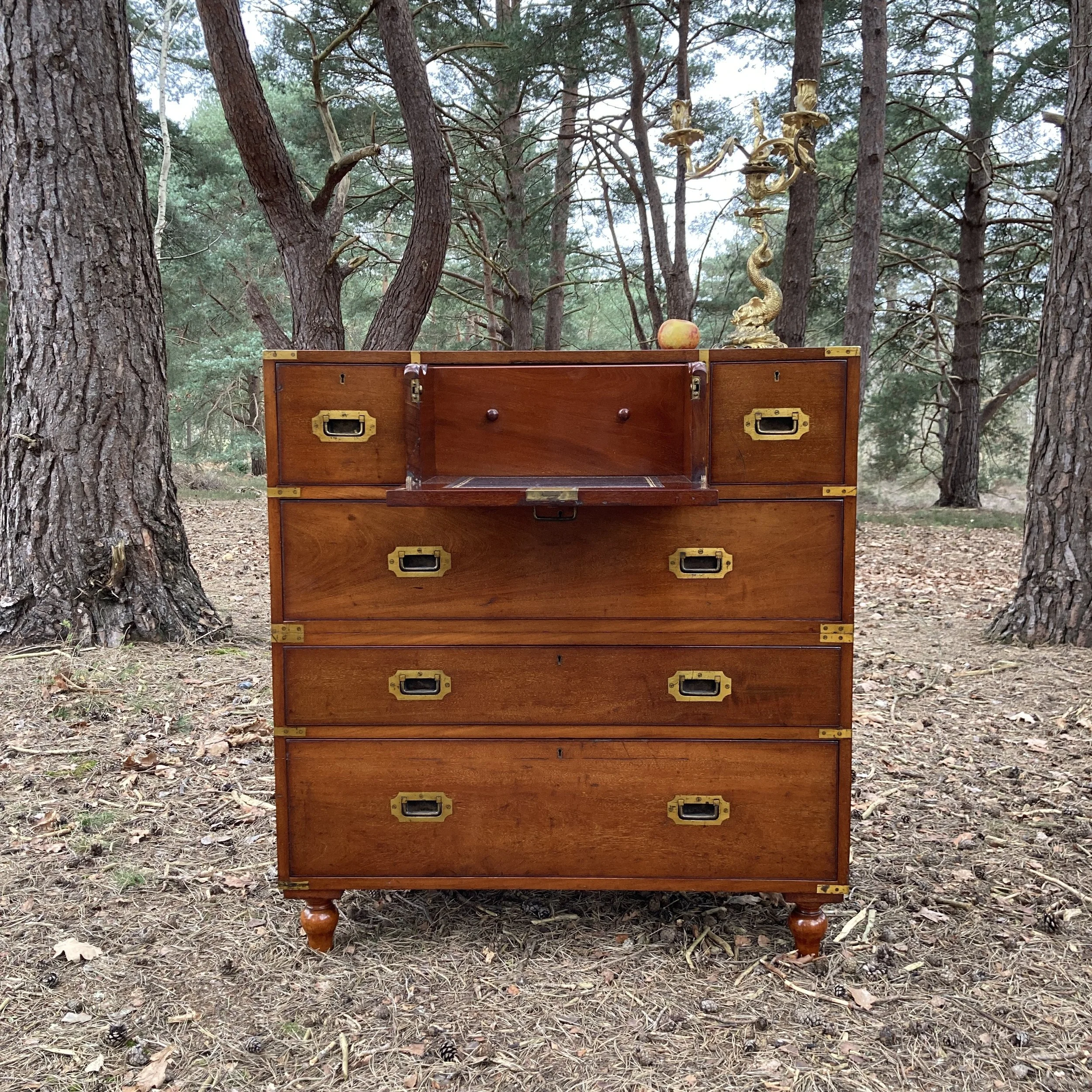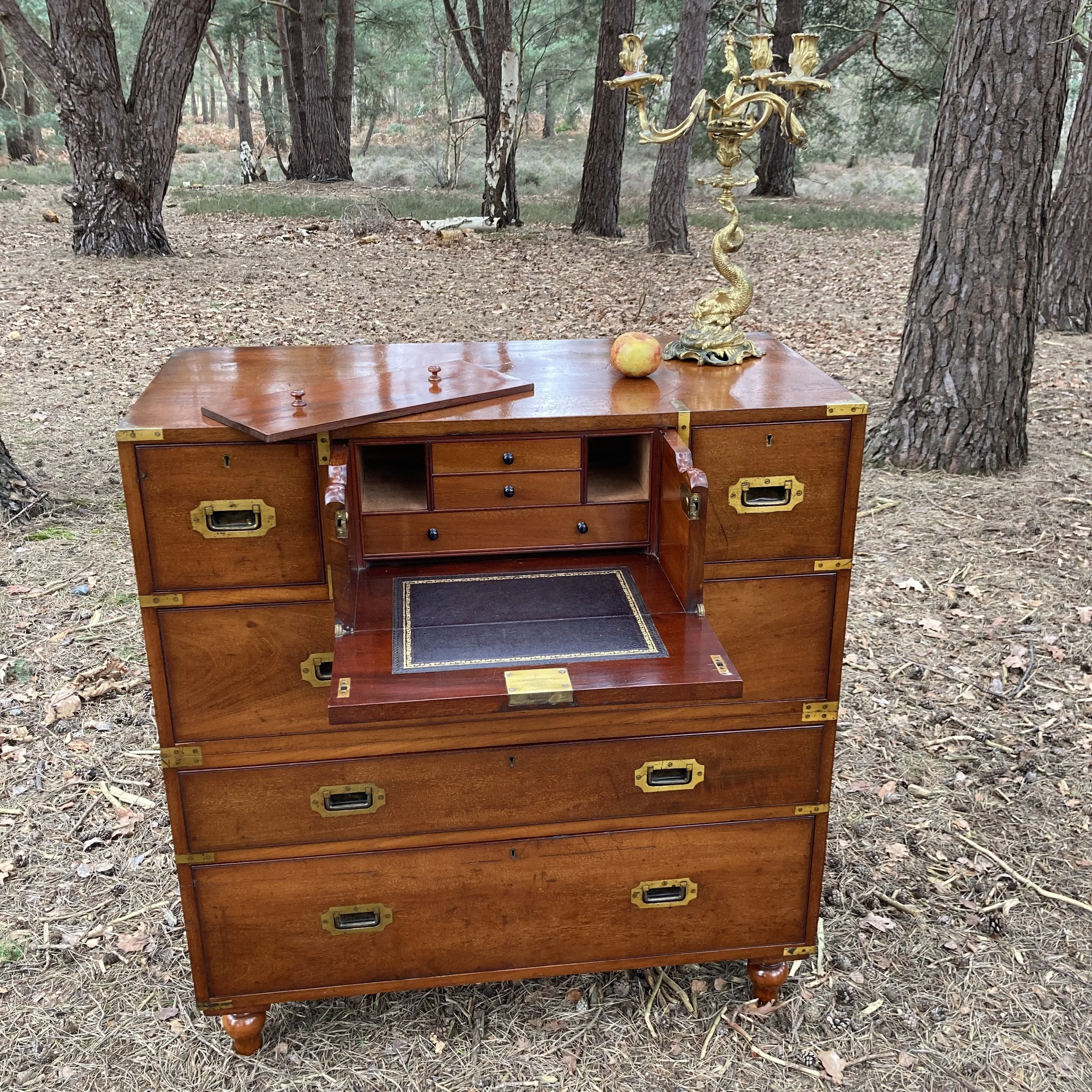 This very smart secretaire military campaign chest exudes elegance and practicality, designed for the discerning traveller of the past. Crafted from rich mahogany and brass bound, it stands as a testament to the high-quality workmanship reminiscent of the esteemed Hill and Millard, despite lacking their signature.