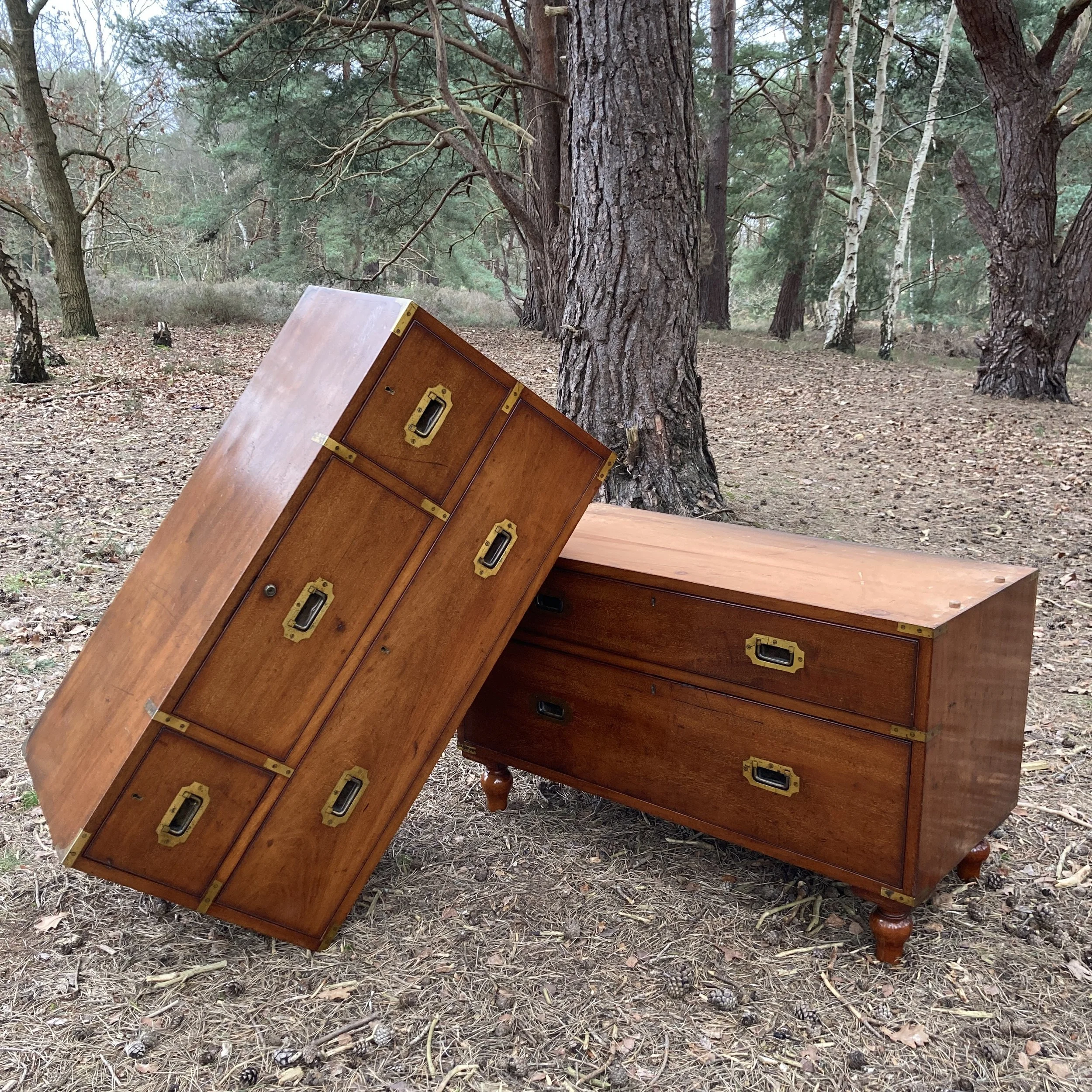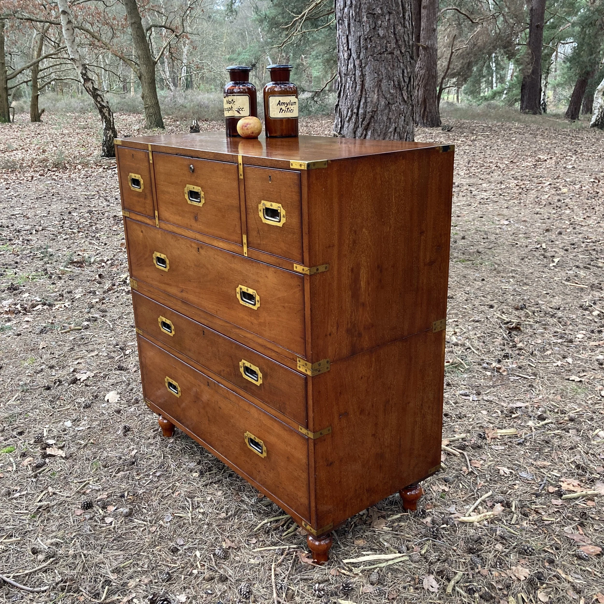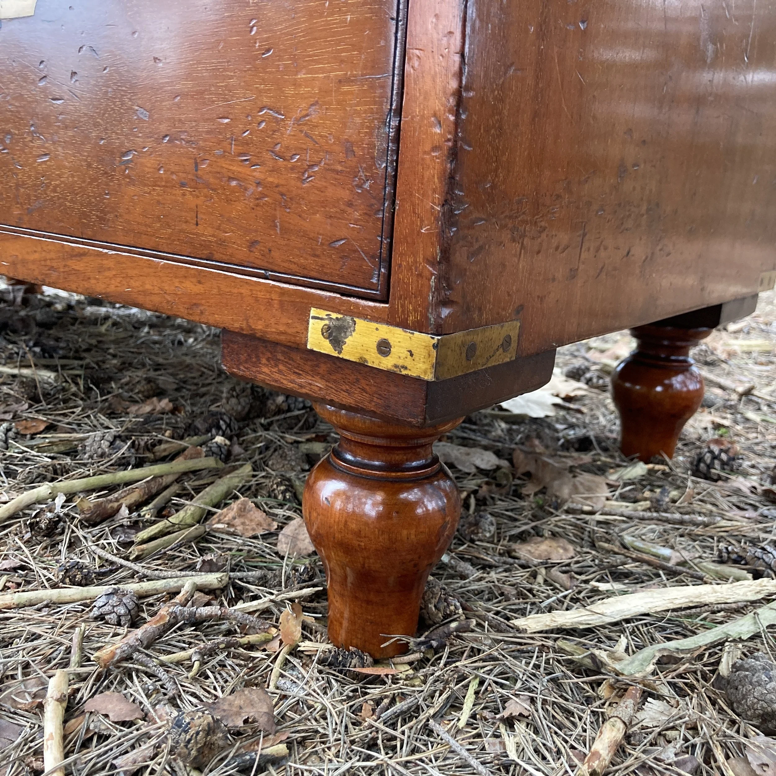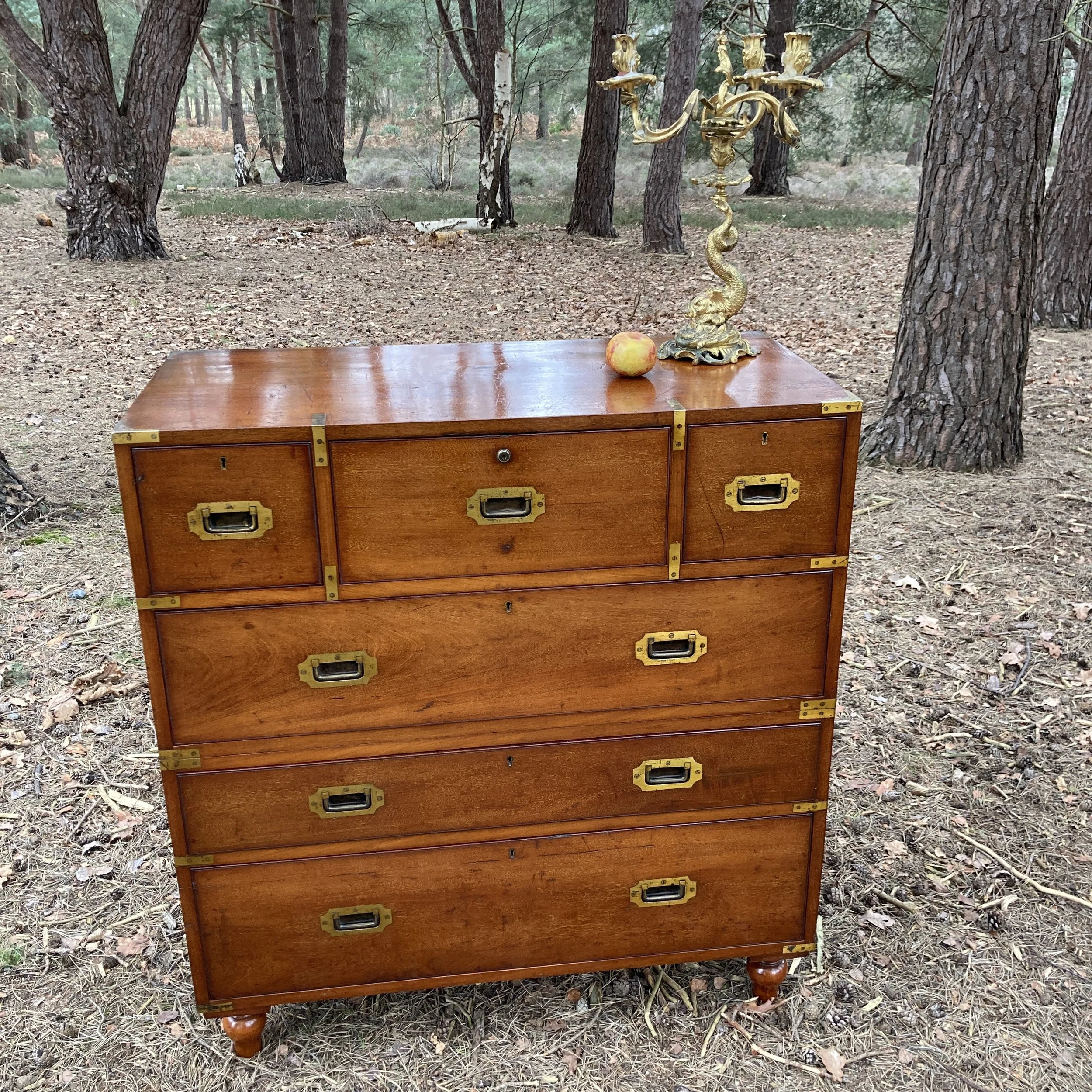 This very smart secretaire military campaign chest exudes elegance and practicality, designed for the discerning traveller of the past. Crafted from rich mahogany and brass bound, it stands as a testament to the high-quality workmanship reminiscent of the esteemed Hill and Millard, despite lacking their signature.