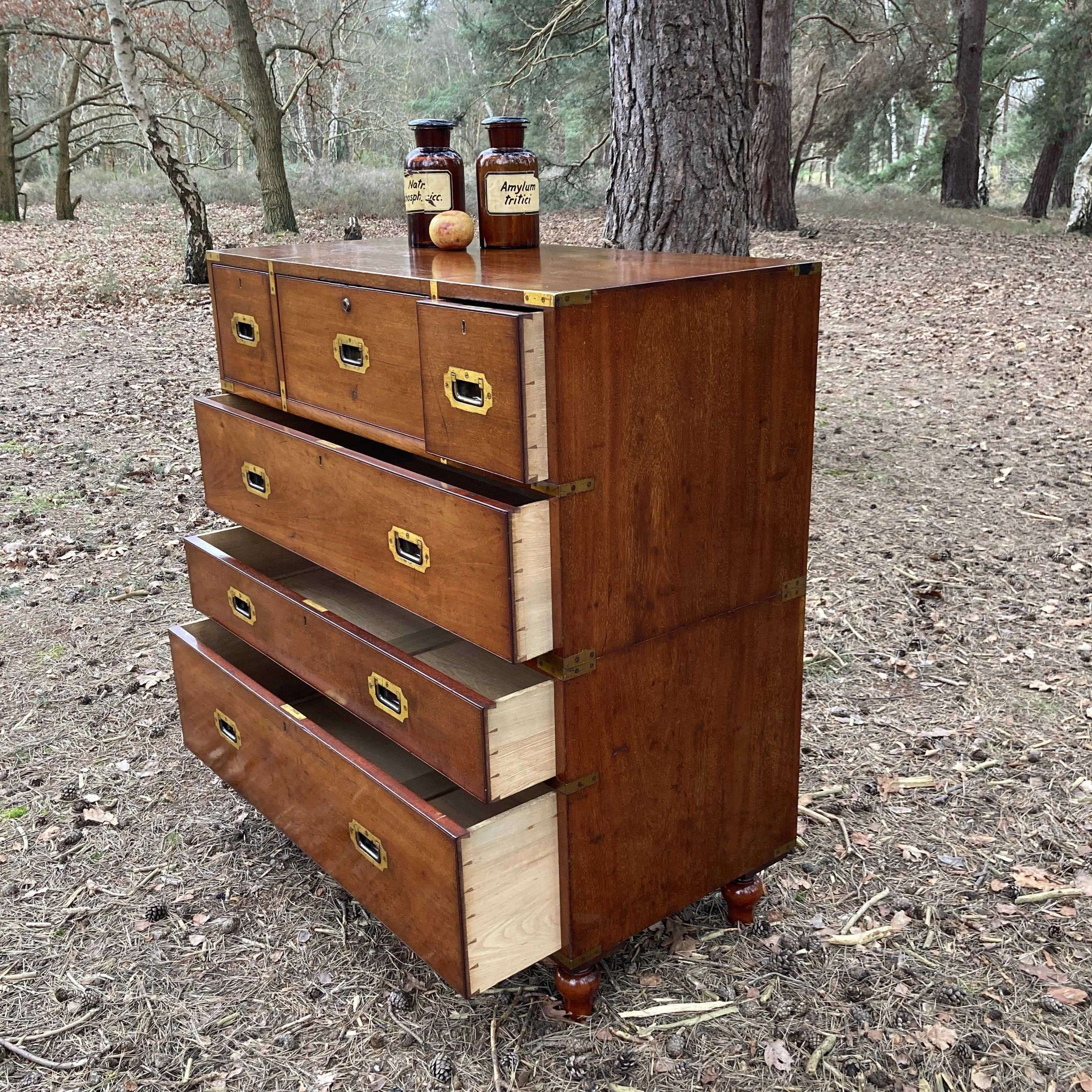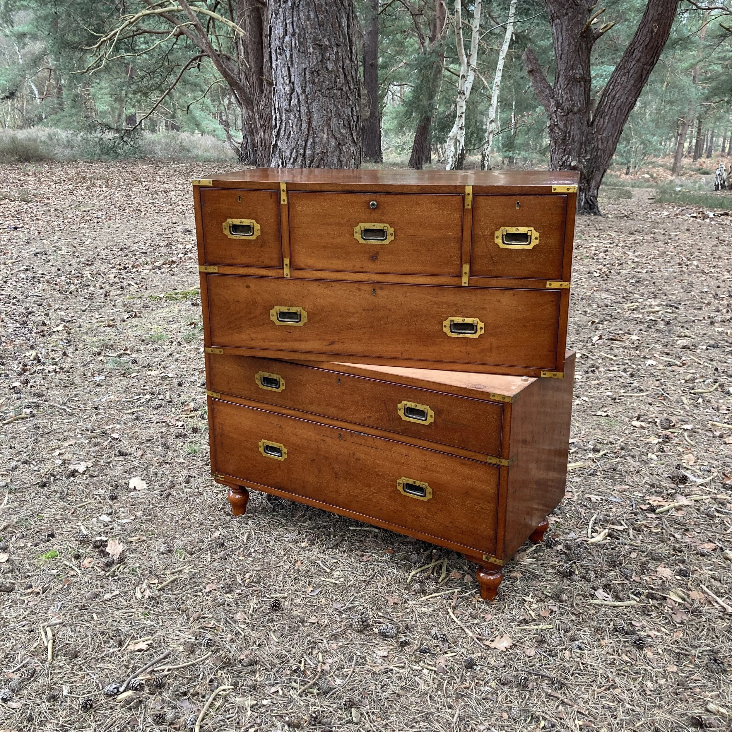 The chest is presented in two sections, each part constructed with the utmost care to maintain its highly original condition. The upper section houses a secretaire drawer, complete with its original retainer board, a clever feature designed to secure the contents within during the rigours of travel. This drawer is neatly organised, offering two short and one long drawer, providing ample space for various items. The secretaire is adorned with an original gilt and blind tooled leather skiver, its intricate decoration catching the eye and inviting one to write upon its luxurious surface. The entire piece rests on removable feet, an ingenious addition that not only adds to its aesthetic but also facilitates ease of transport – a nod to its military campaign heritage.
