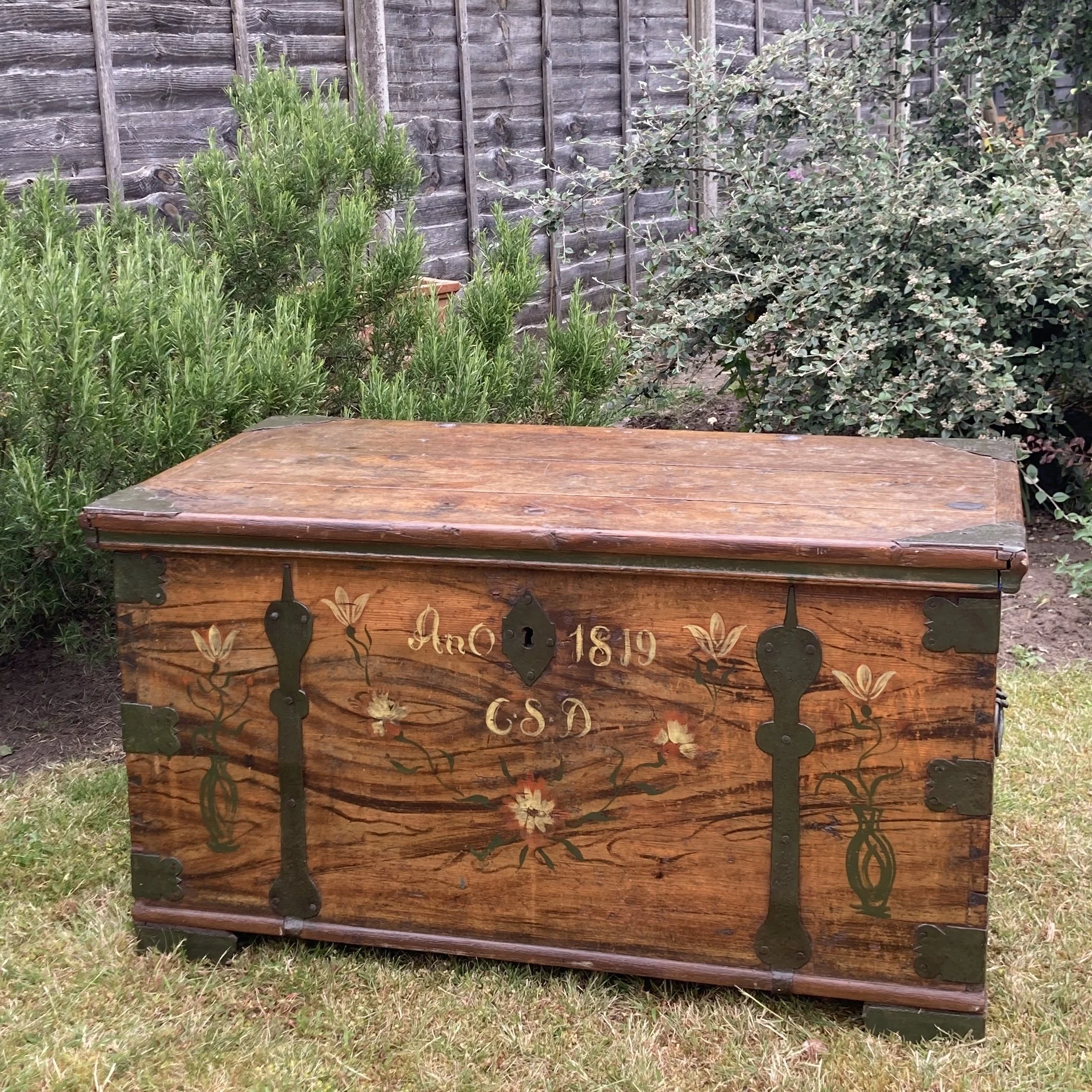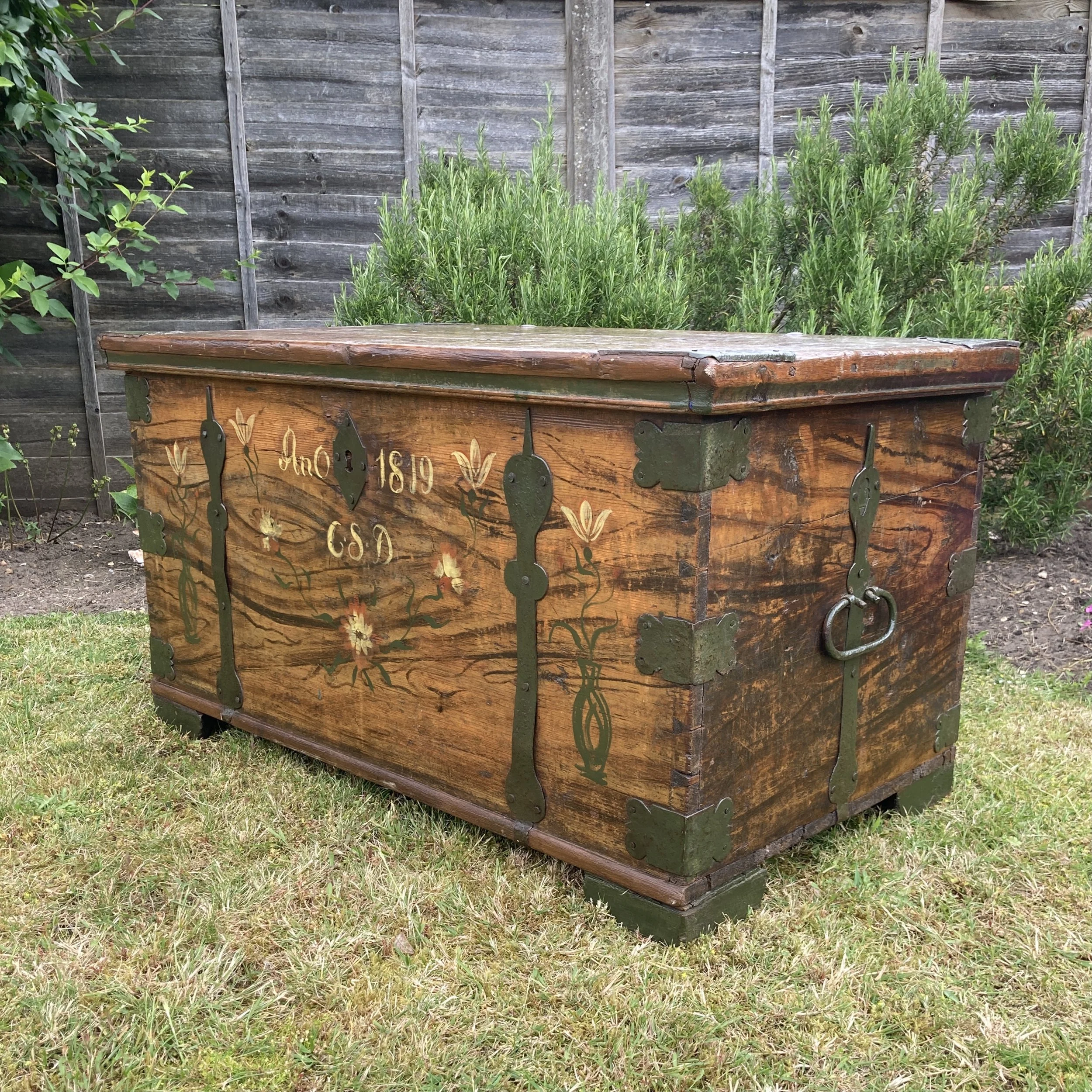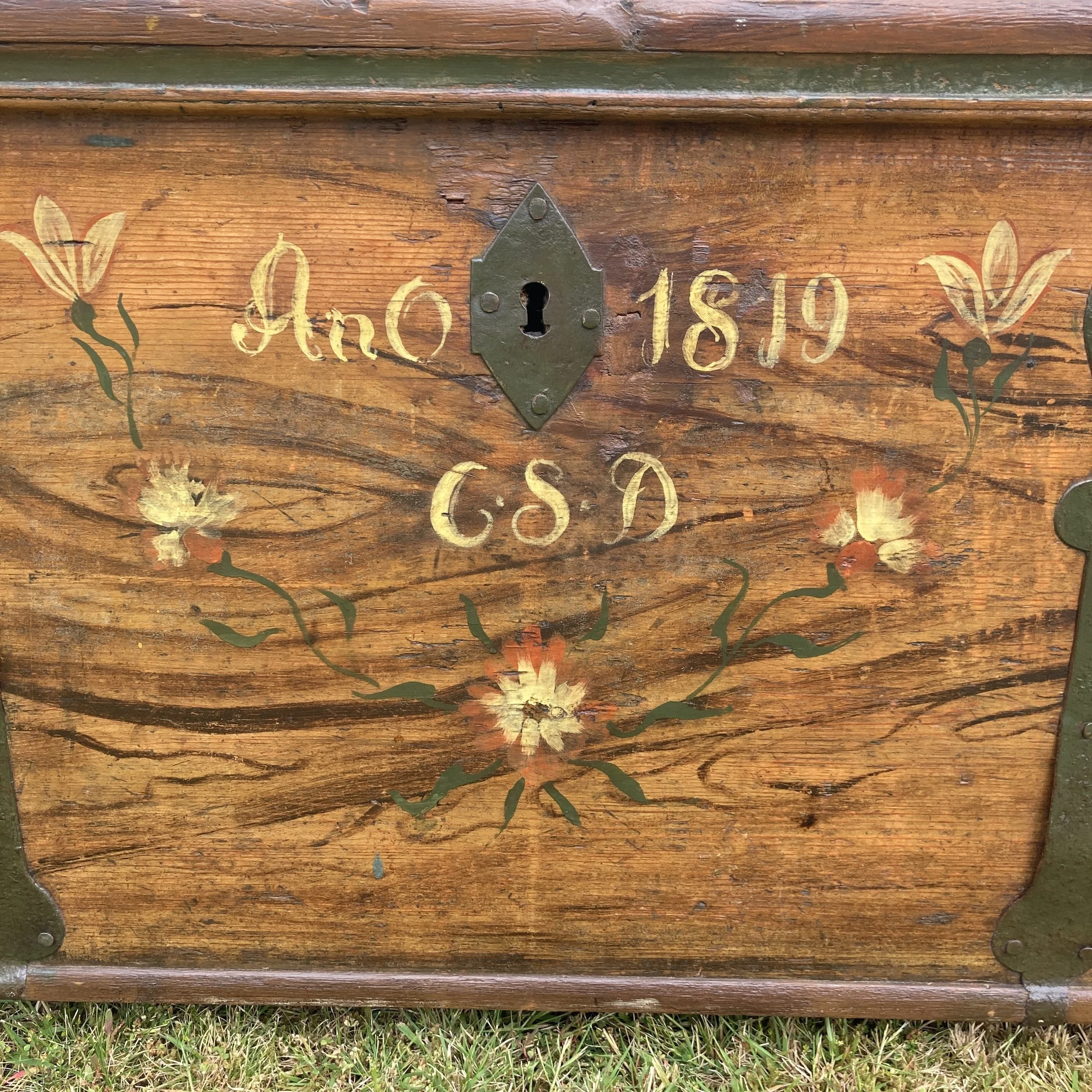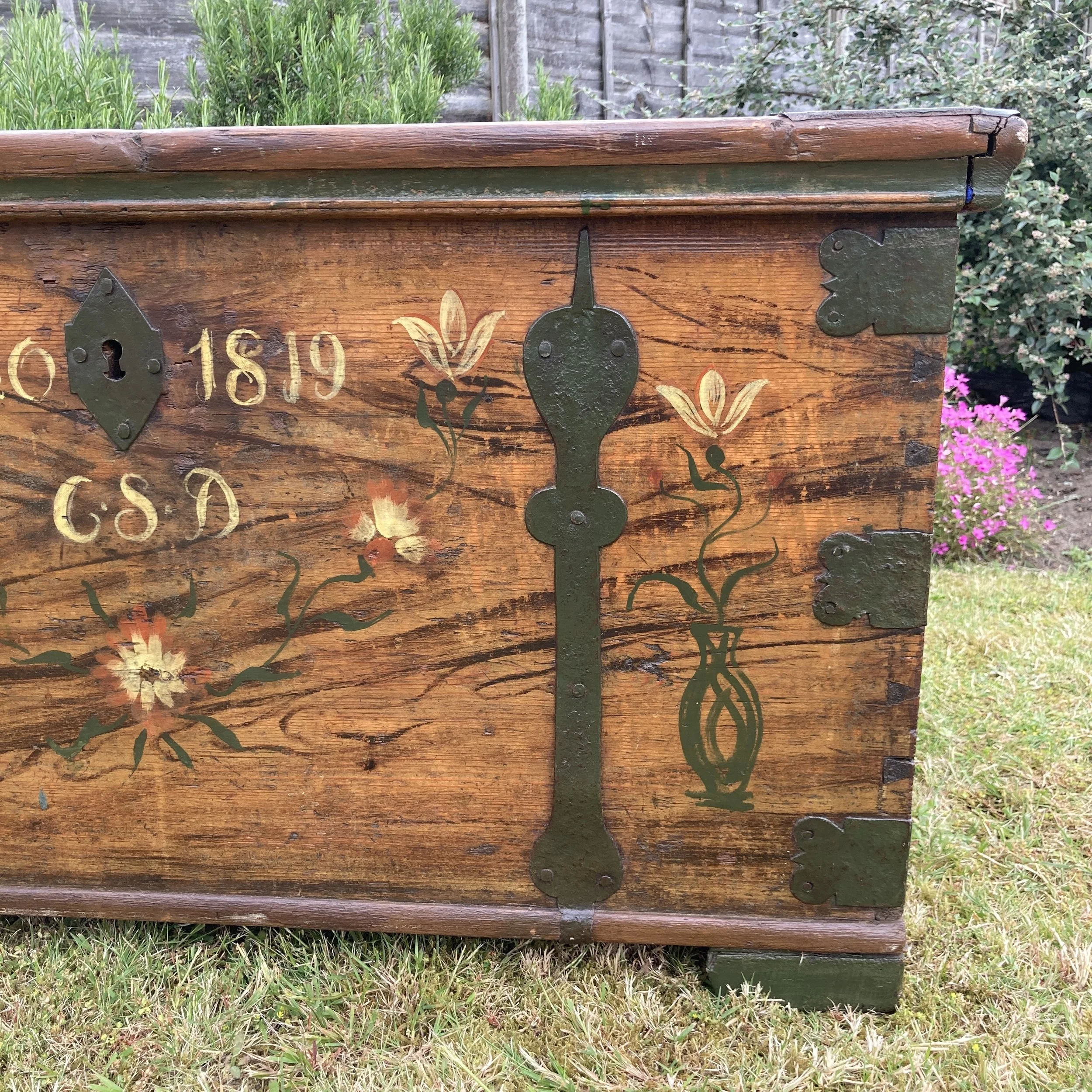This exquisite Swedish pine marriage chest, dating back to circa 1819, is a testament to the craftsmanship and artistry of the period. The chest is adorned with a charming painted grain and intricate floral decoration, evoking a sense of rustic elegance. The construction showcases traditional hand-cut dovetail joints, which not only provide robust durability but also add to the visual appeal with their precise and interlocking design.