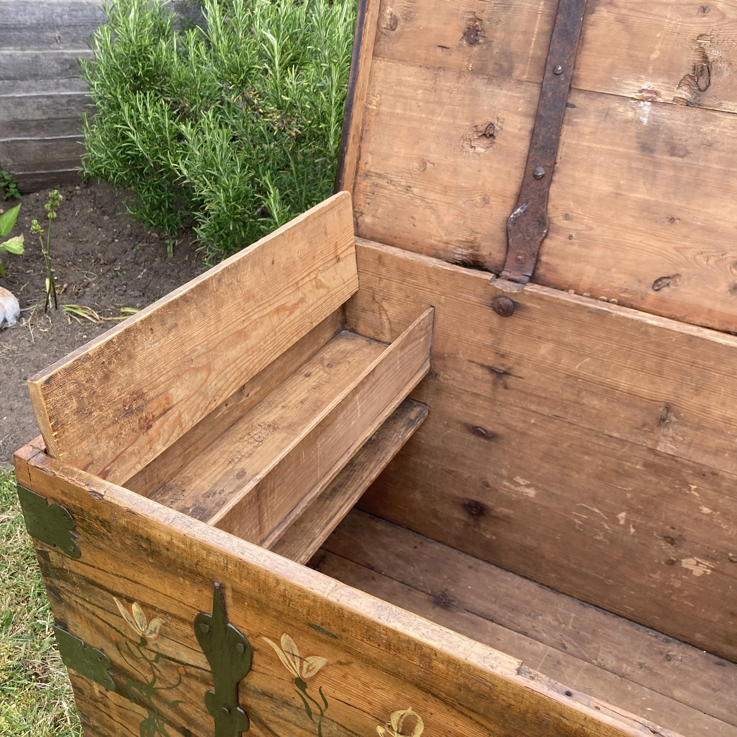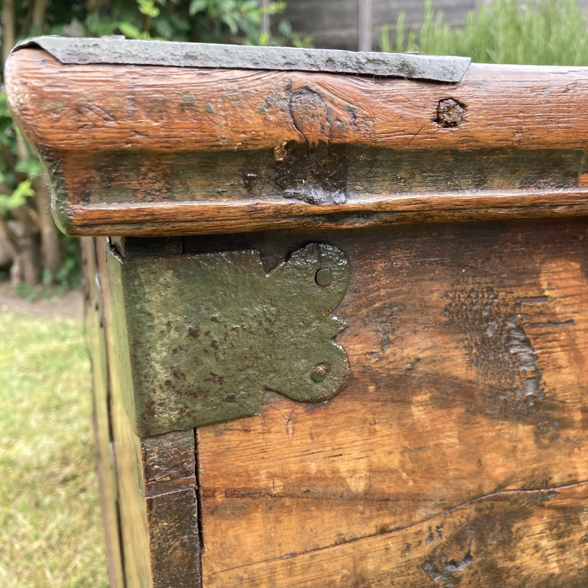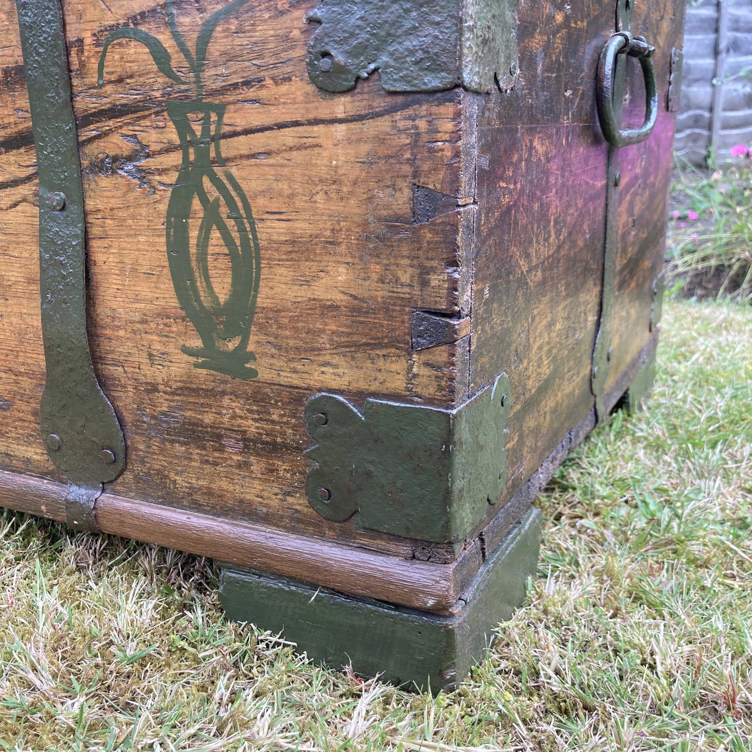 Adding to its authenticity, the chest features original decorative metalwork that enhances its antique character. The side carrying handles, crafted from metal, are not only functional but also contribute to the overall aesthetic with their ornamental design.