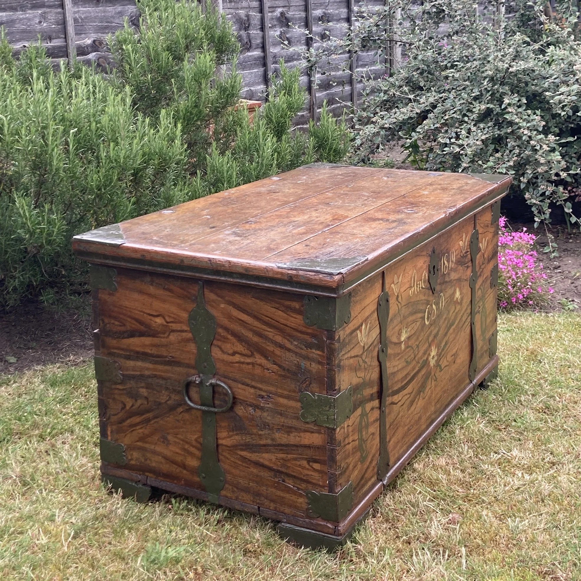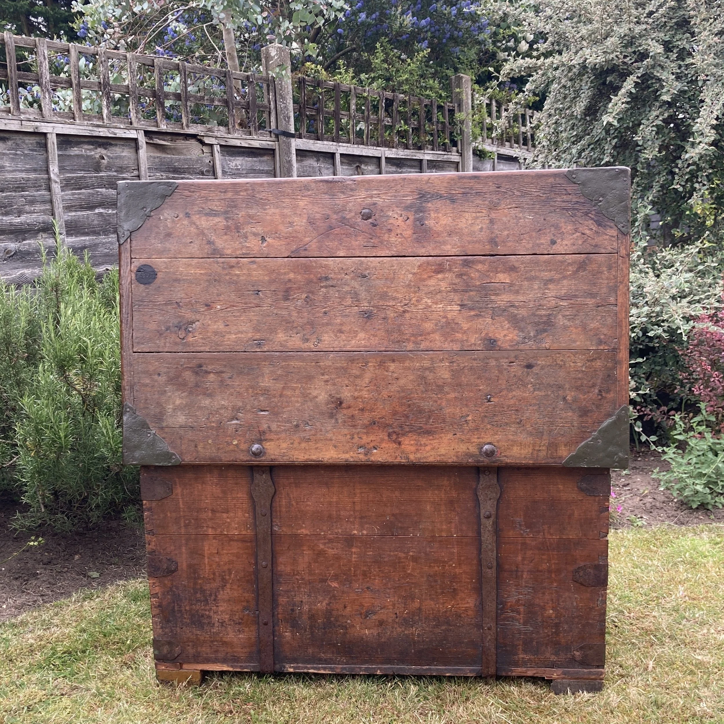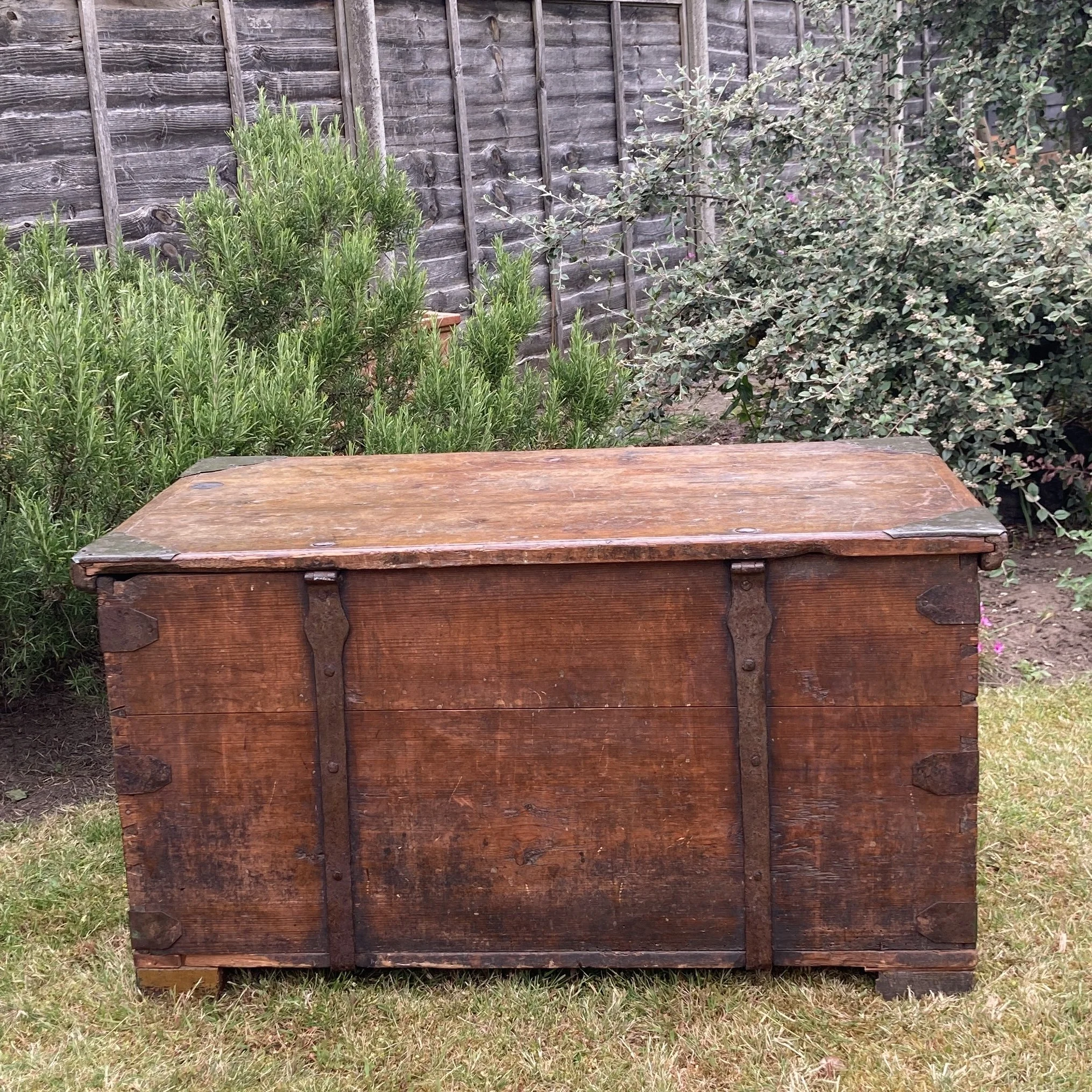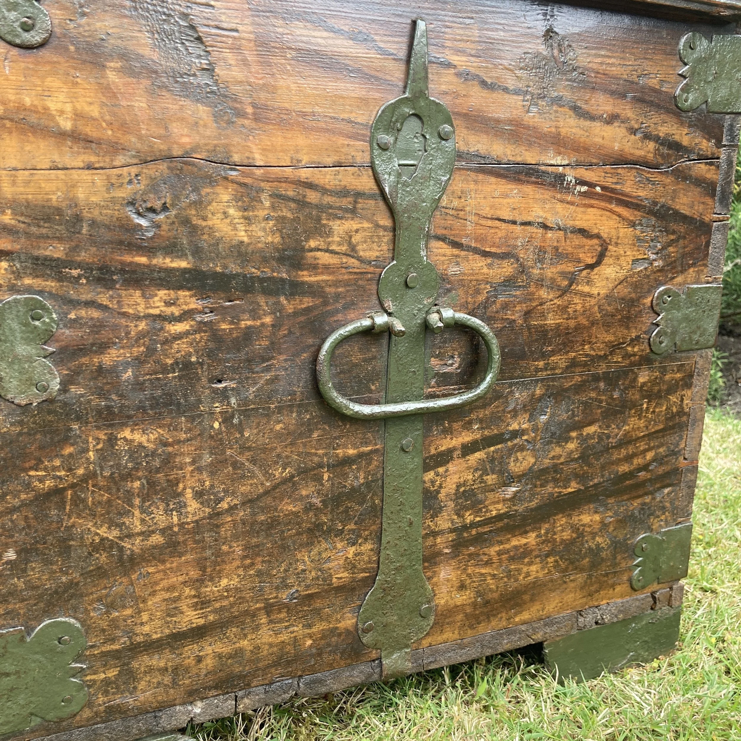 Adding to its authenticity, the chest features original decorative metalwork that enhances its antique character. The side carrying handles, crafted from metal, are not only functional but also contribute to the overall aesthetic with their ornamental design.