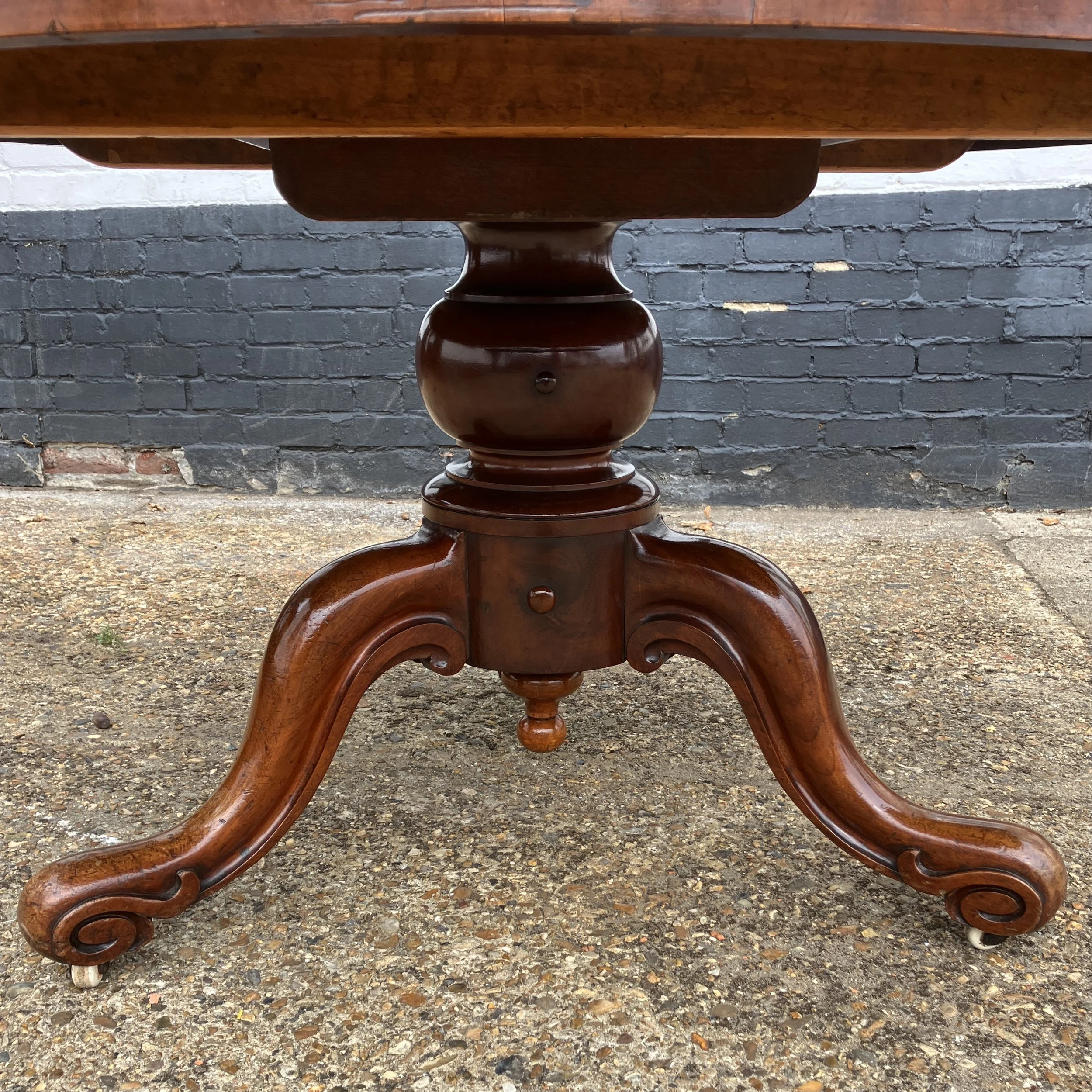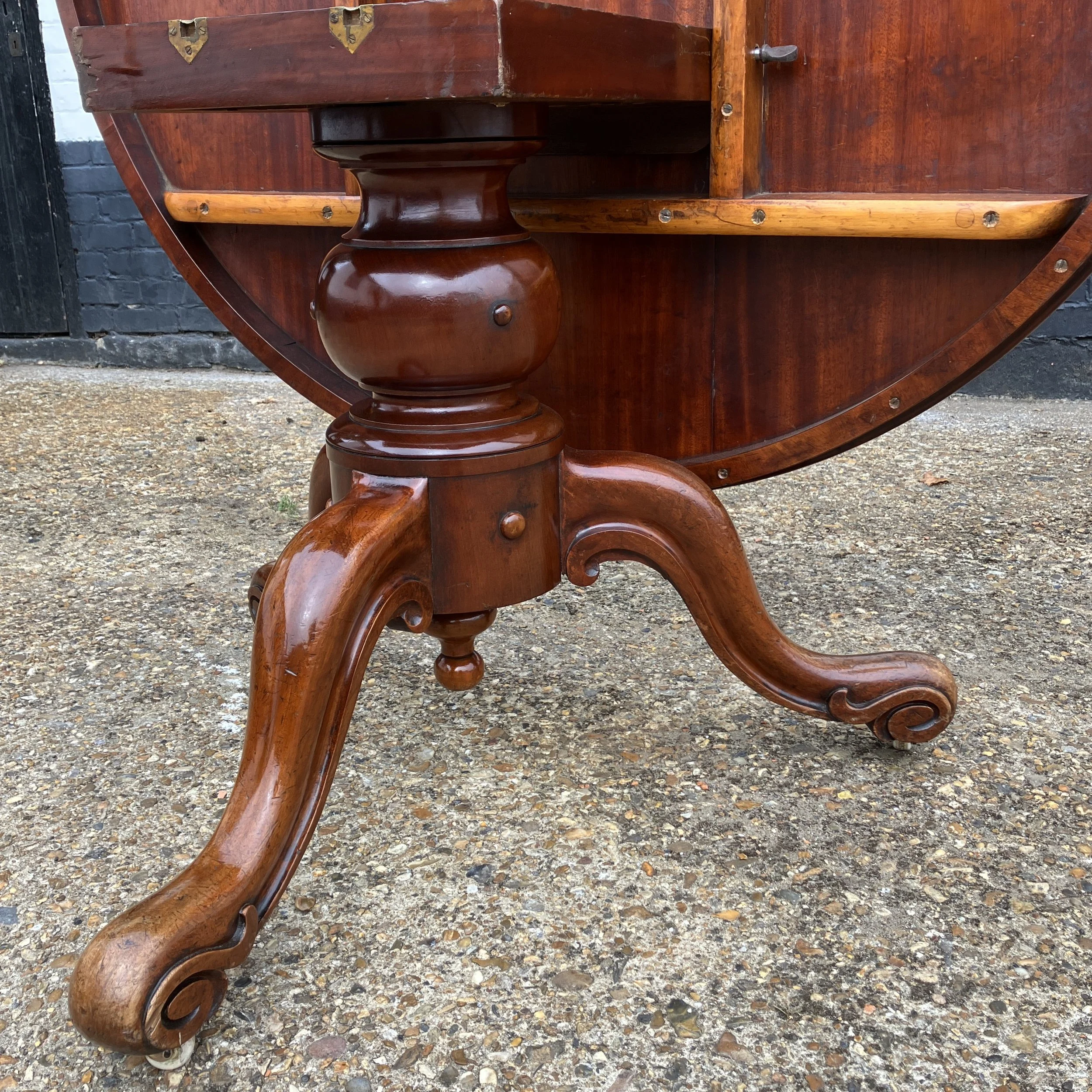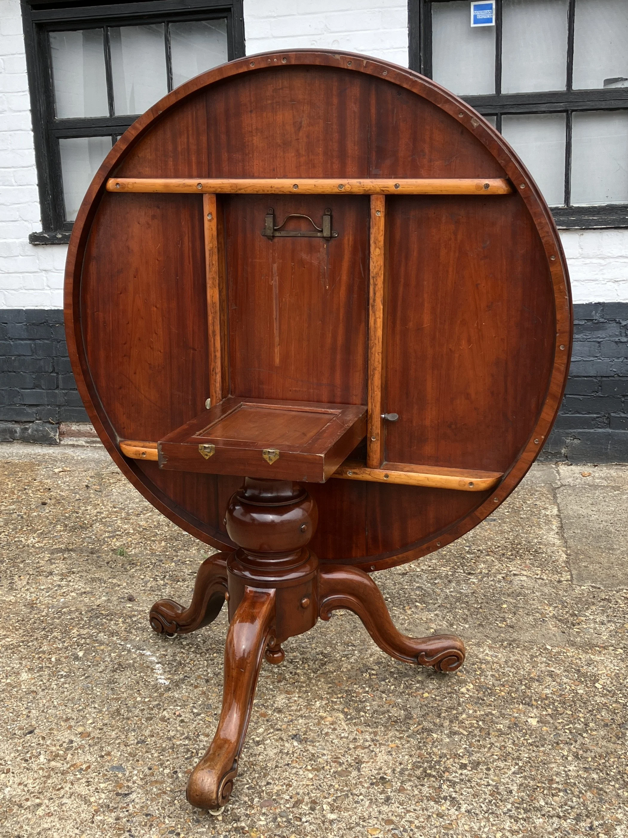 The table is mounted on a sturdy pedestal base with carved legs, offering both stability and refined character. The underside reveals the traditional brass catch and mechanism, allowing the tabletop to tilt vertically when not in use. This feature makes it especially practical for rooms where space-saving is important, combining both functionality and antique charm.
