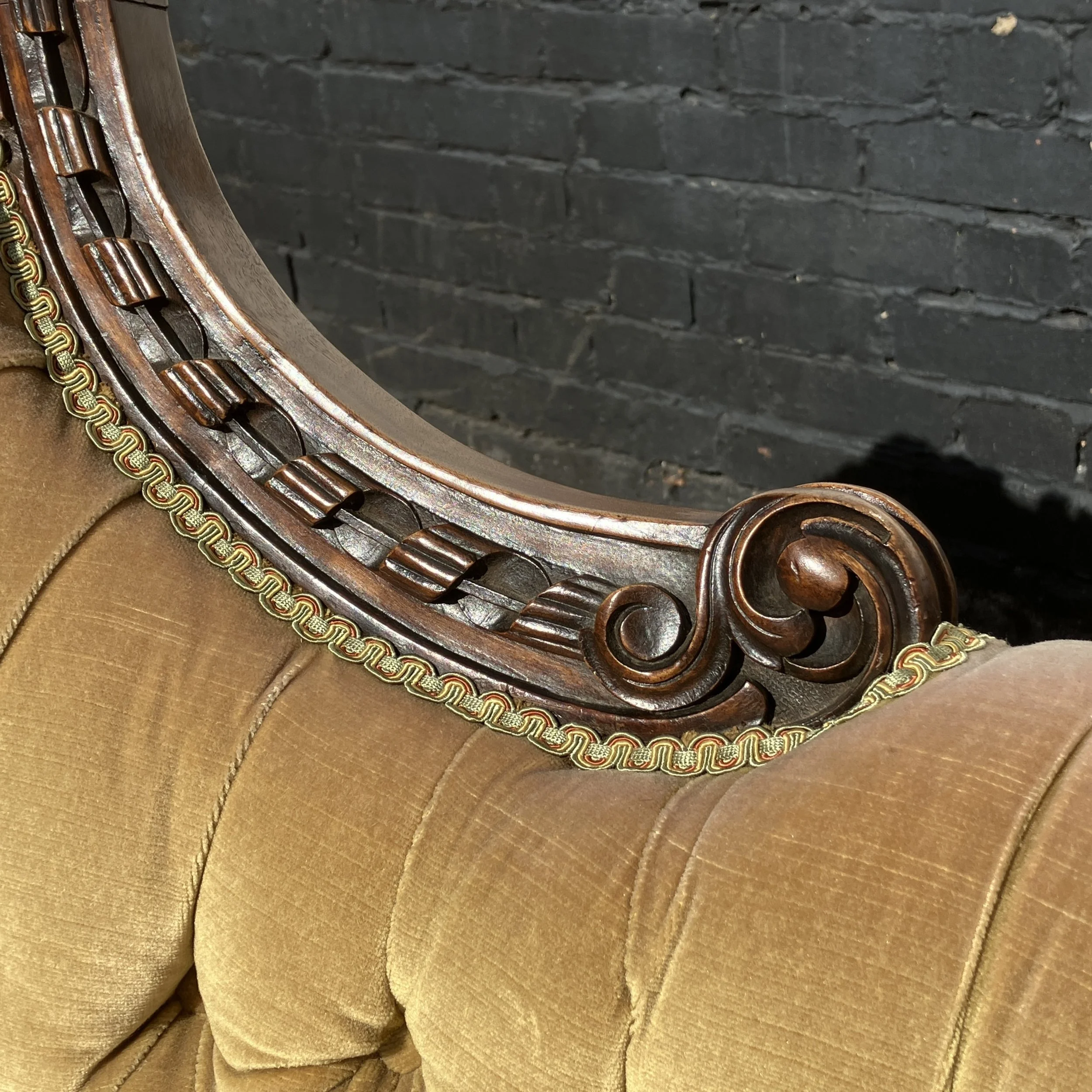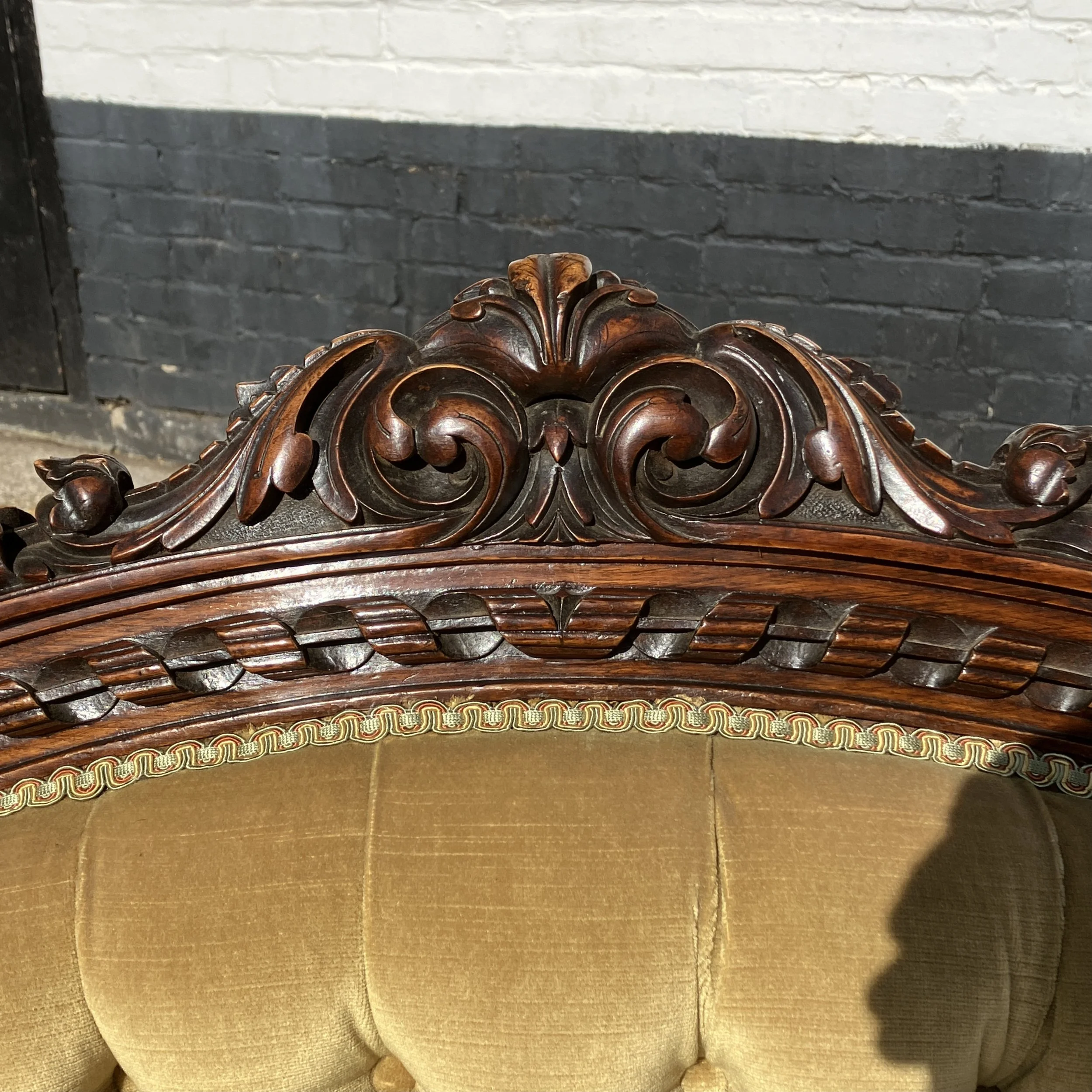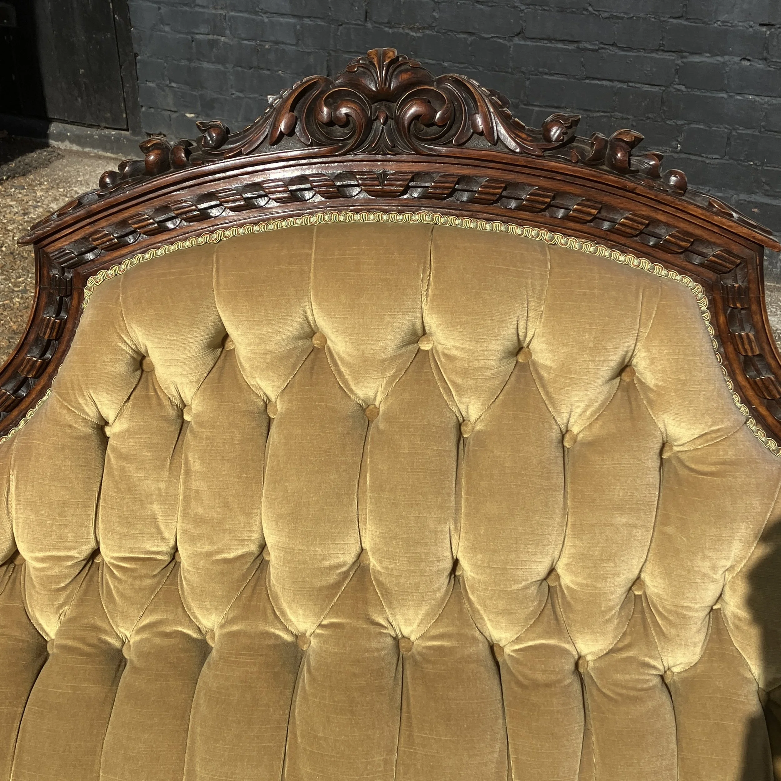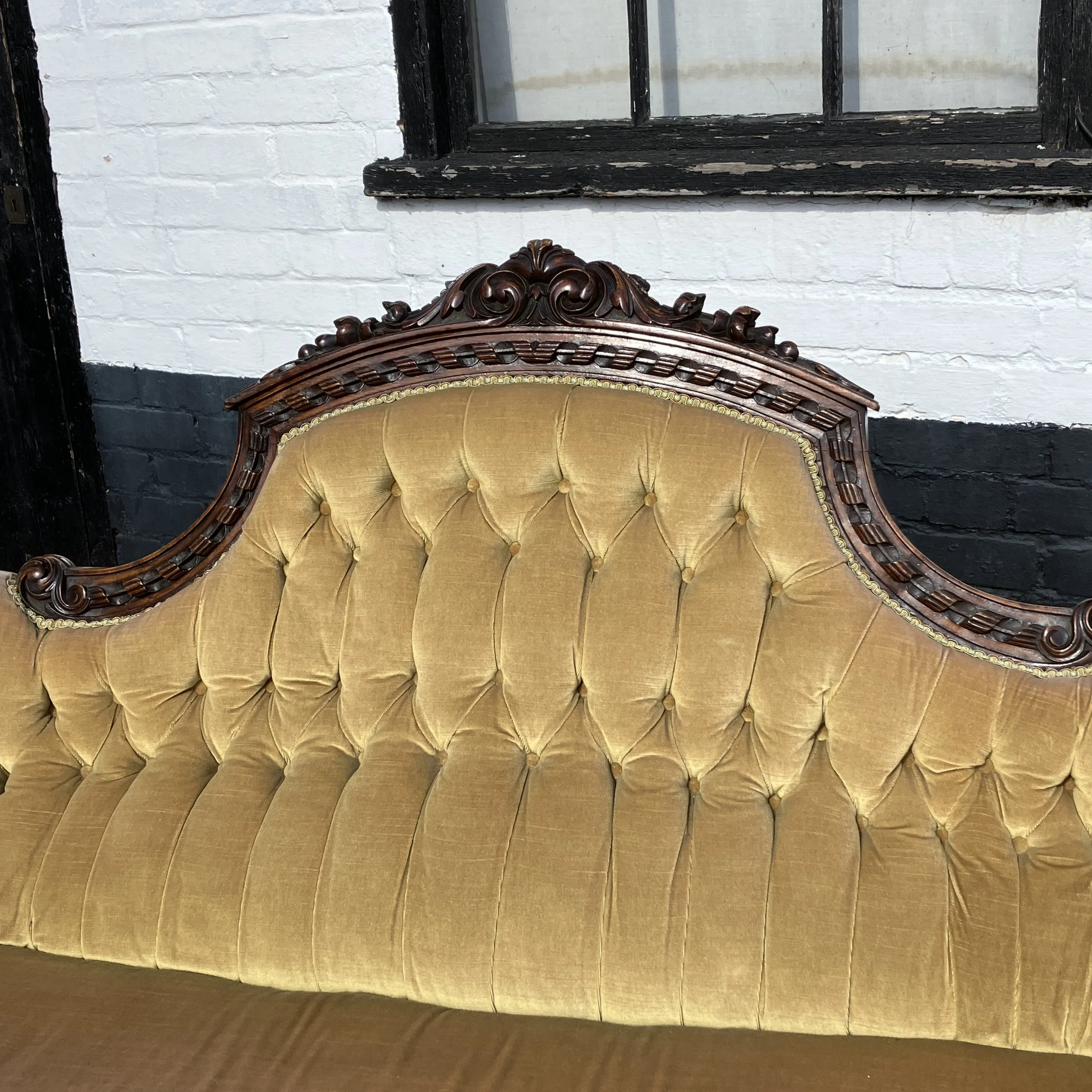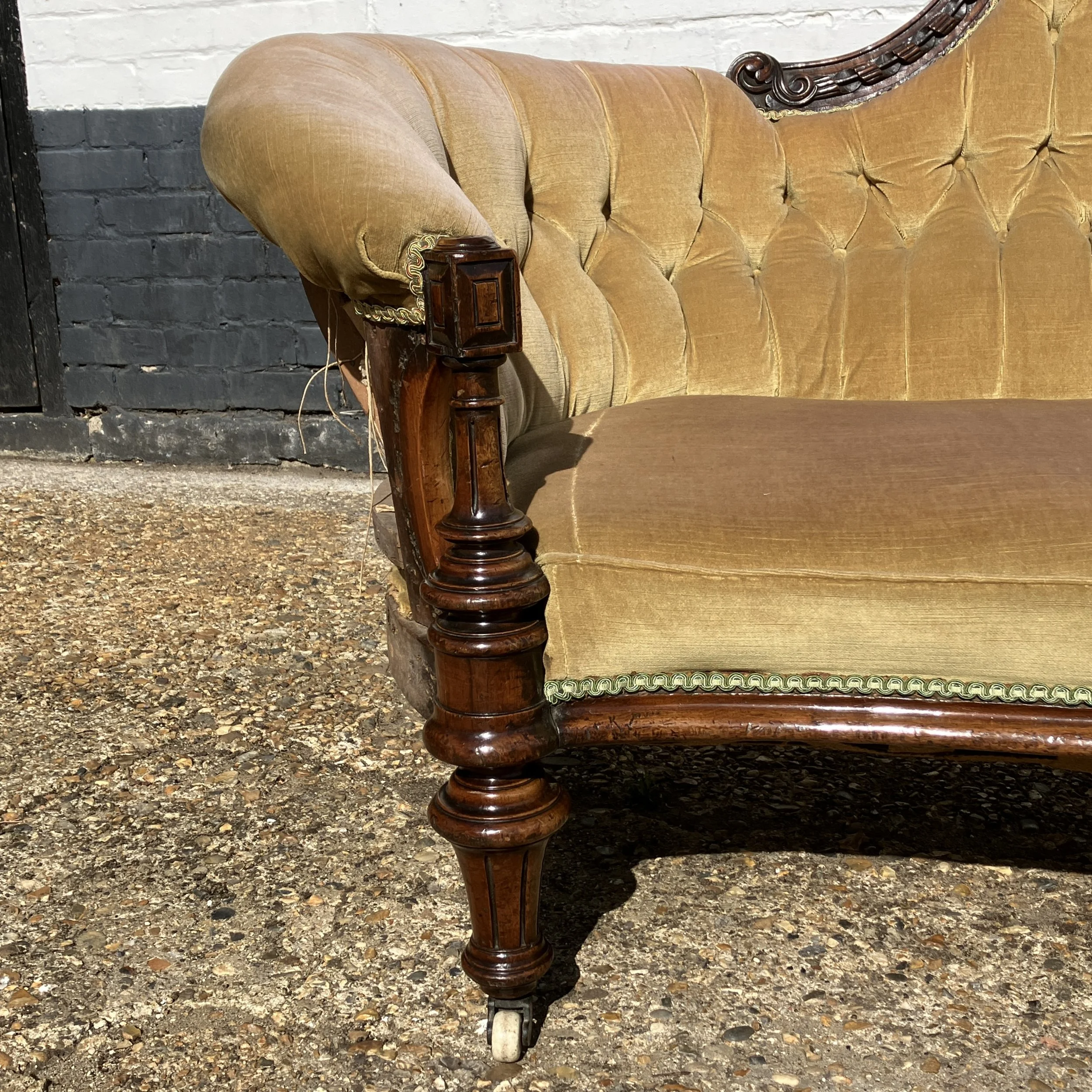 This beautiful antique Victorian sofa / settee with an ornately carved walnut frame and elegant button-back upholstery. The high, arched back is finished with intricate hand-carved detailing, while the deep-buttoned golden velvet fabric enhances its classic charm. The turned front legs are set on original castors, making it both practical and decorative. Its sweeping, scrolled arms and generous seat give it a refined yet comfortable presence.