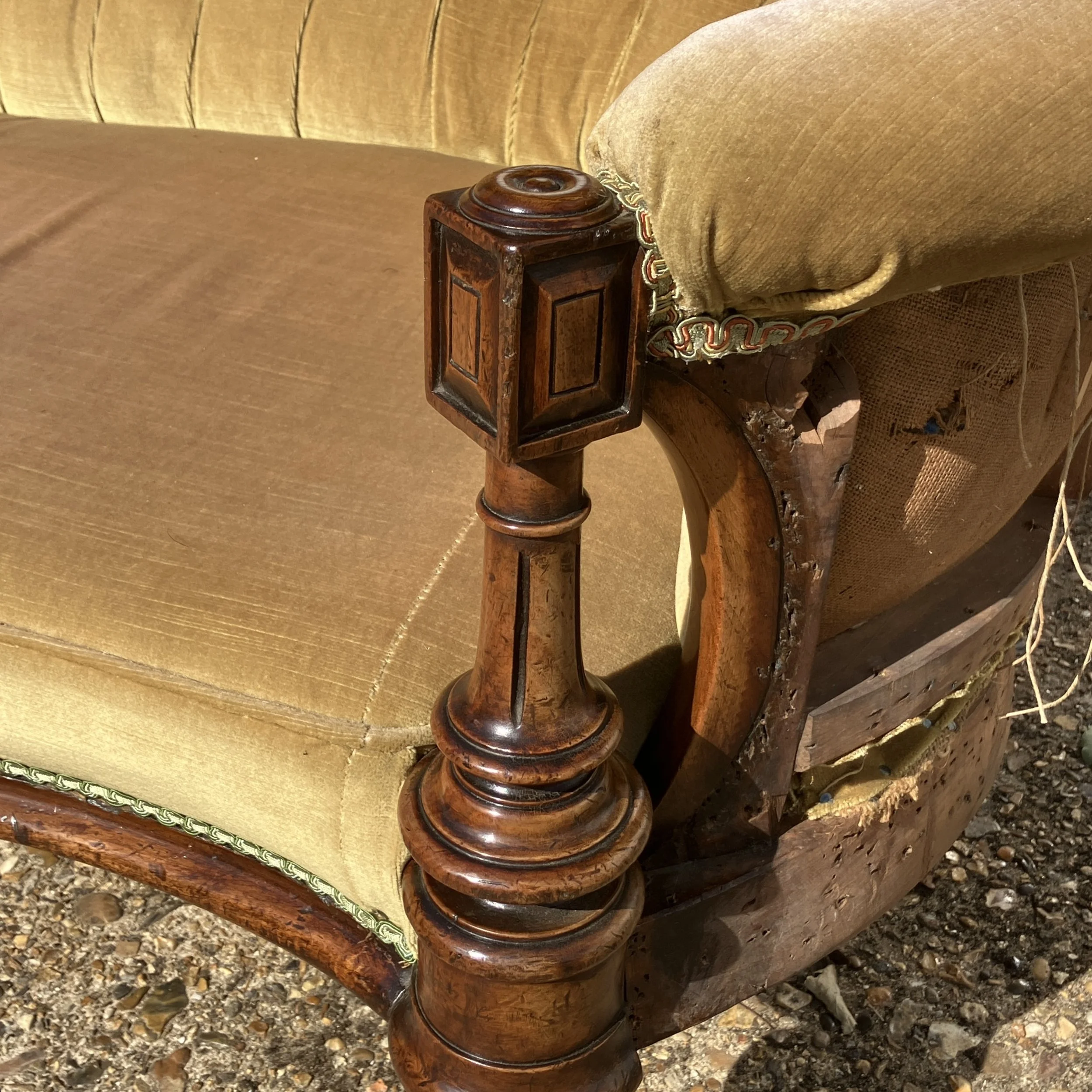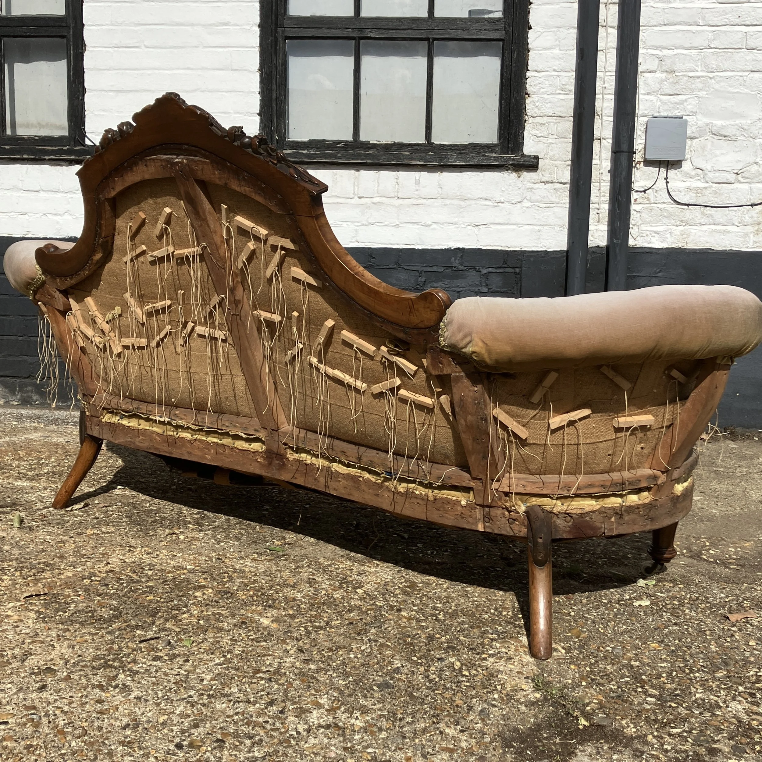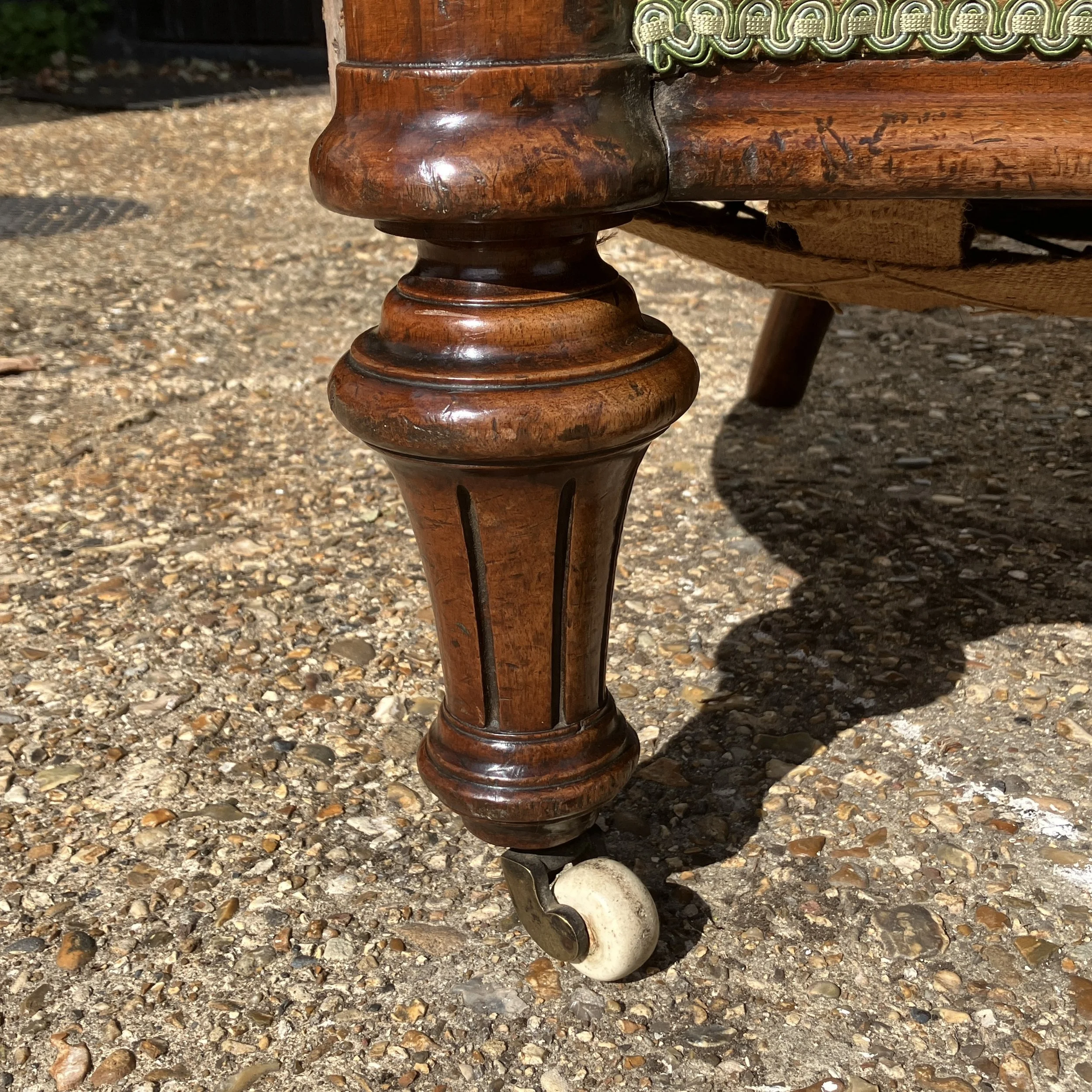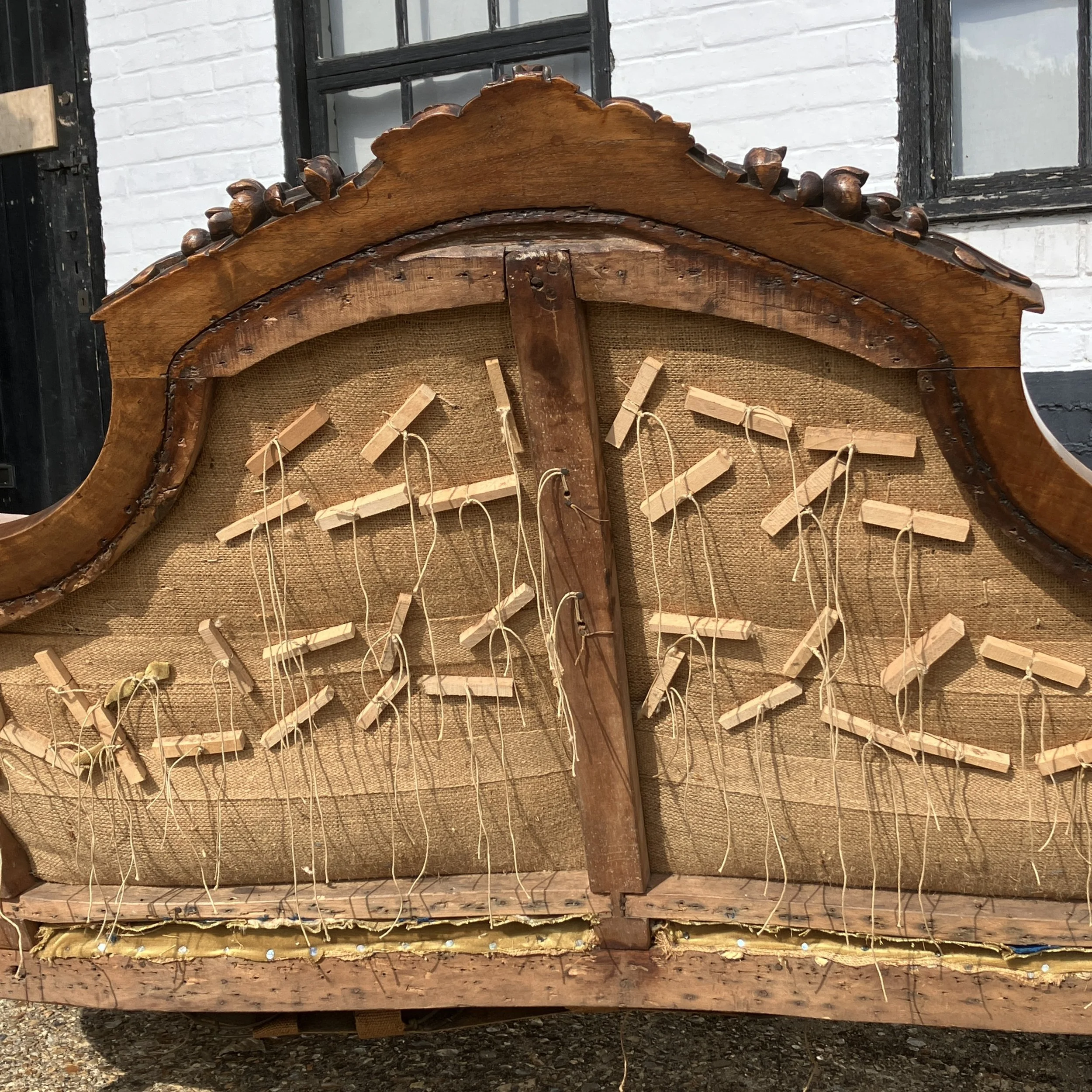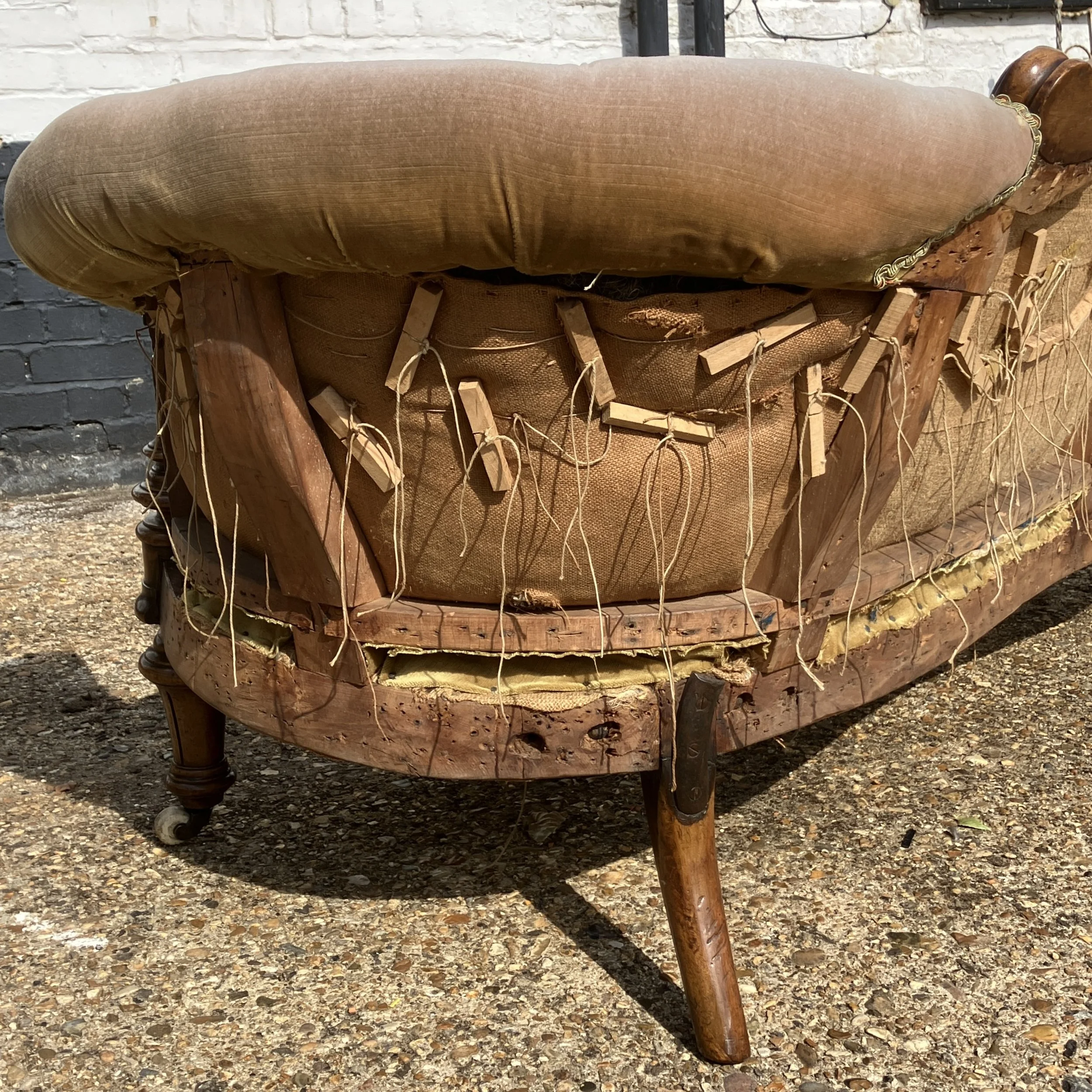 The rear of the piece reveals traditional 19th-century craftsmanship, with original webbing, hand-tied buttons, and wooden peg construction, all indicative of its authenticity and period quality. The frame is sturdy, with a wonderful patina that only time can bring. While the fabric shows some signs of age, it remains presentable, and the sofa could be enjoyed as is or reupholstered to suit personal taste.